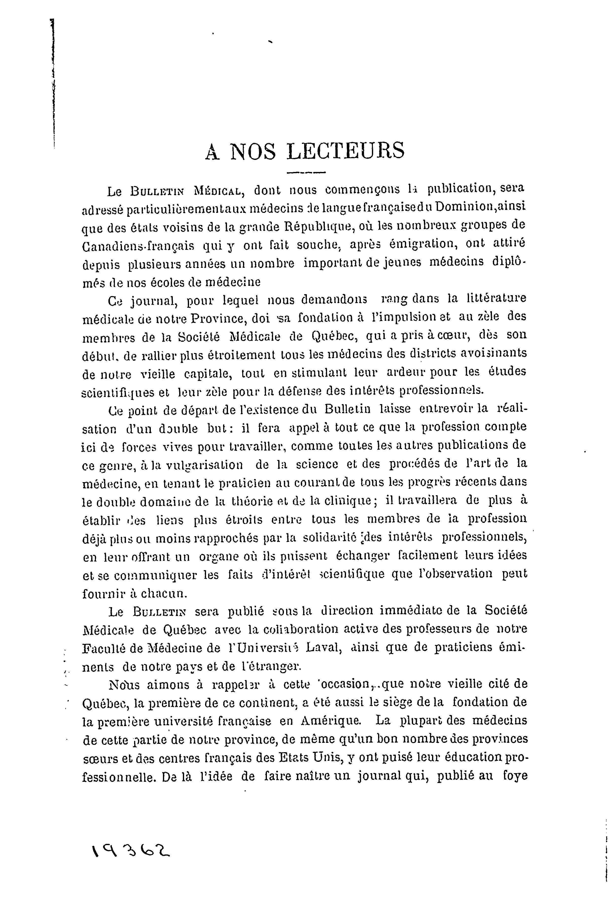 - Le bulletin médical de Québec : 1ère année, no 1 (sept. 1899)
