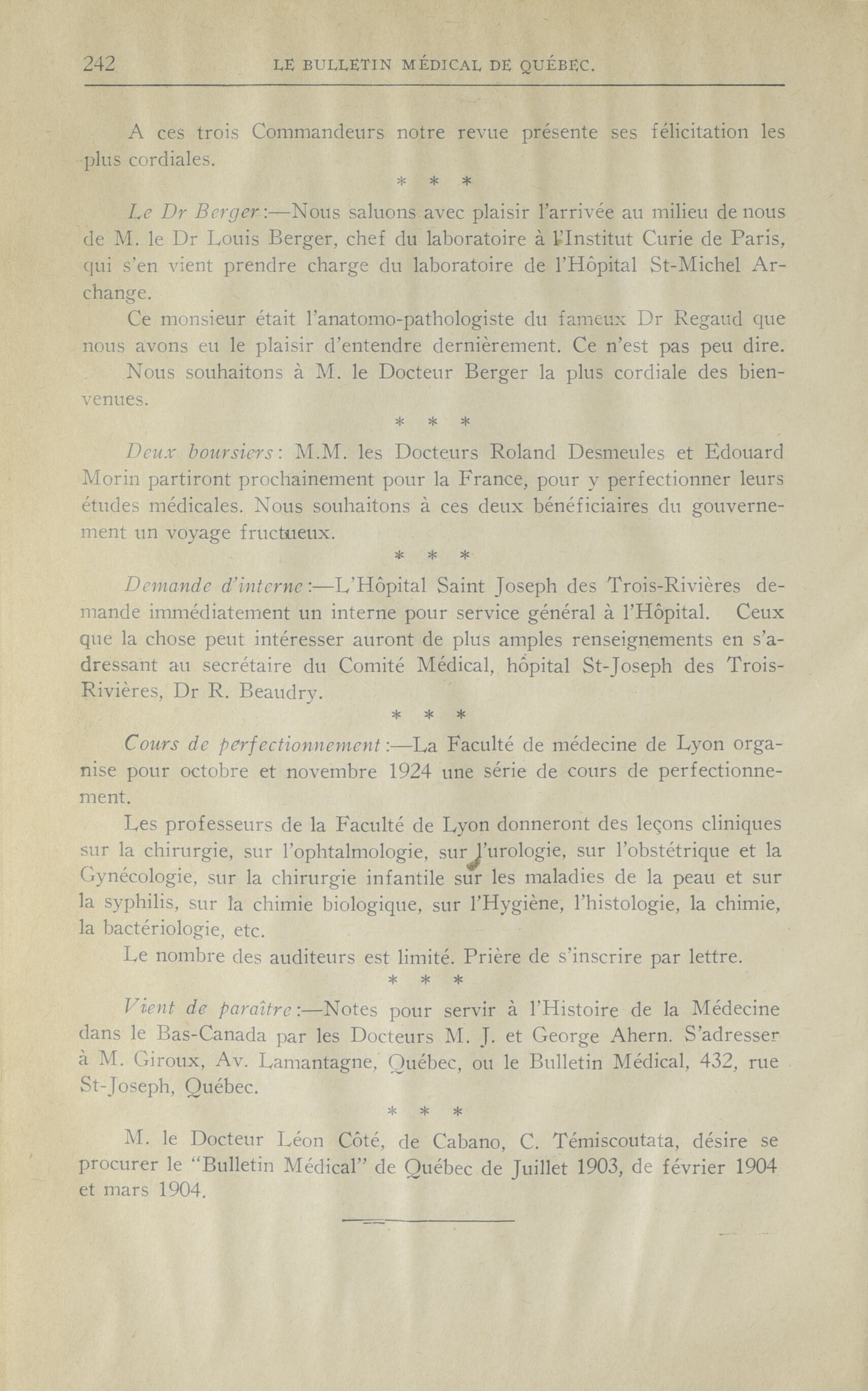 Le bulletin médical de Québec : Le bulletin médical de Québec : [août 1924]