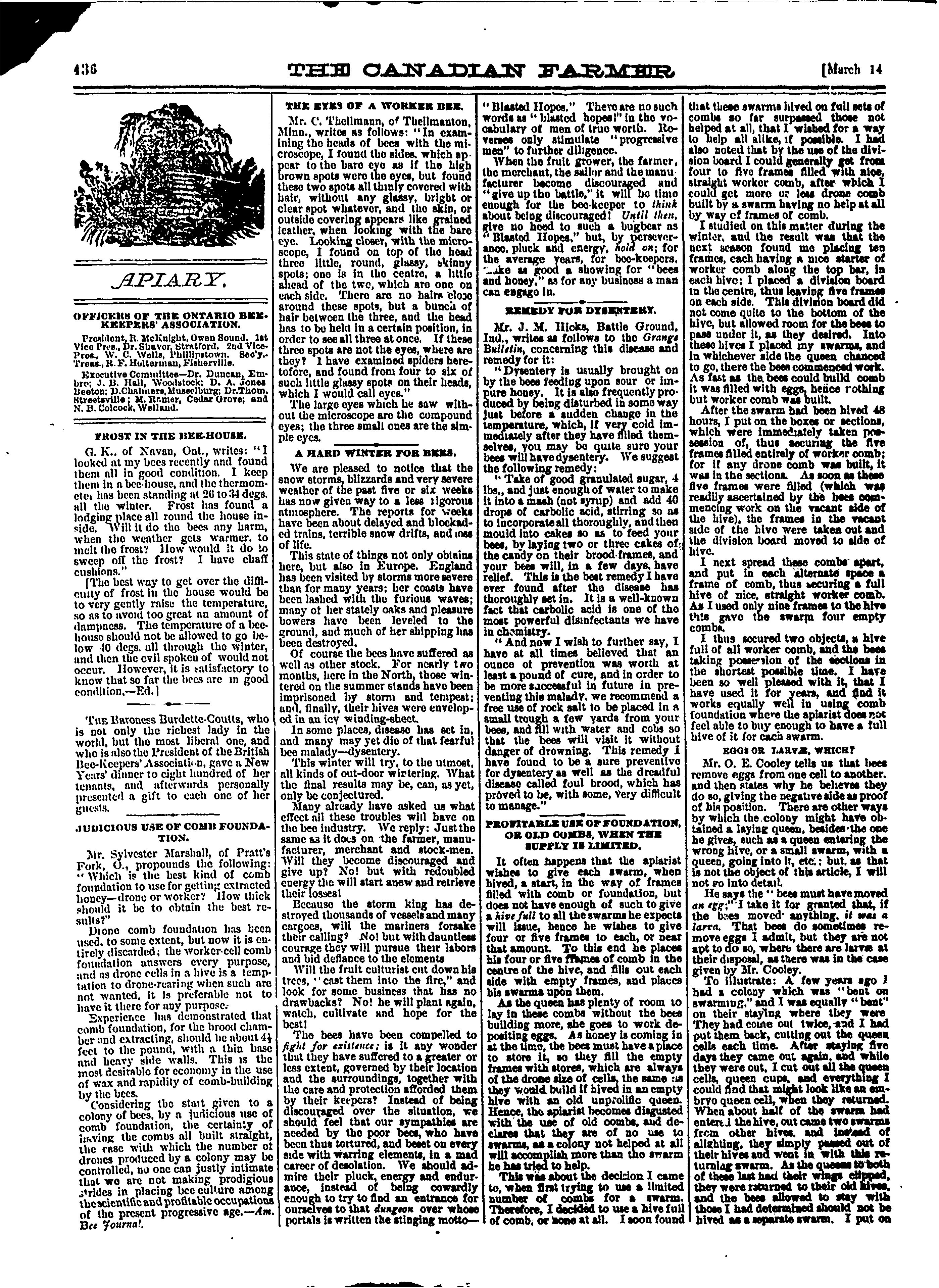 - The Canadian farmer and grange record and organ of the Ontario Bee-Keepers' Association [Vol. 5, no. 28 (Mar. 14, 1883)]