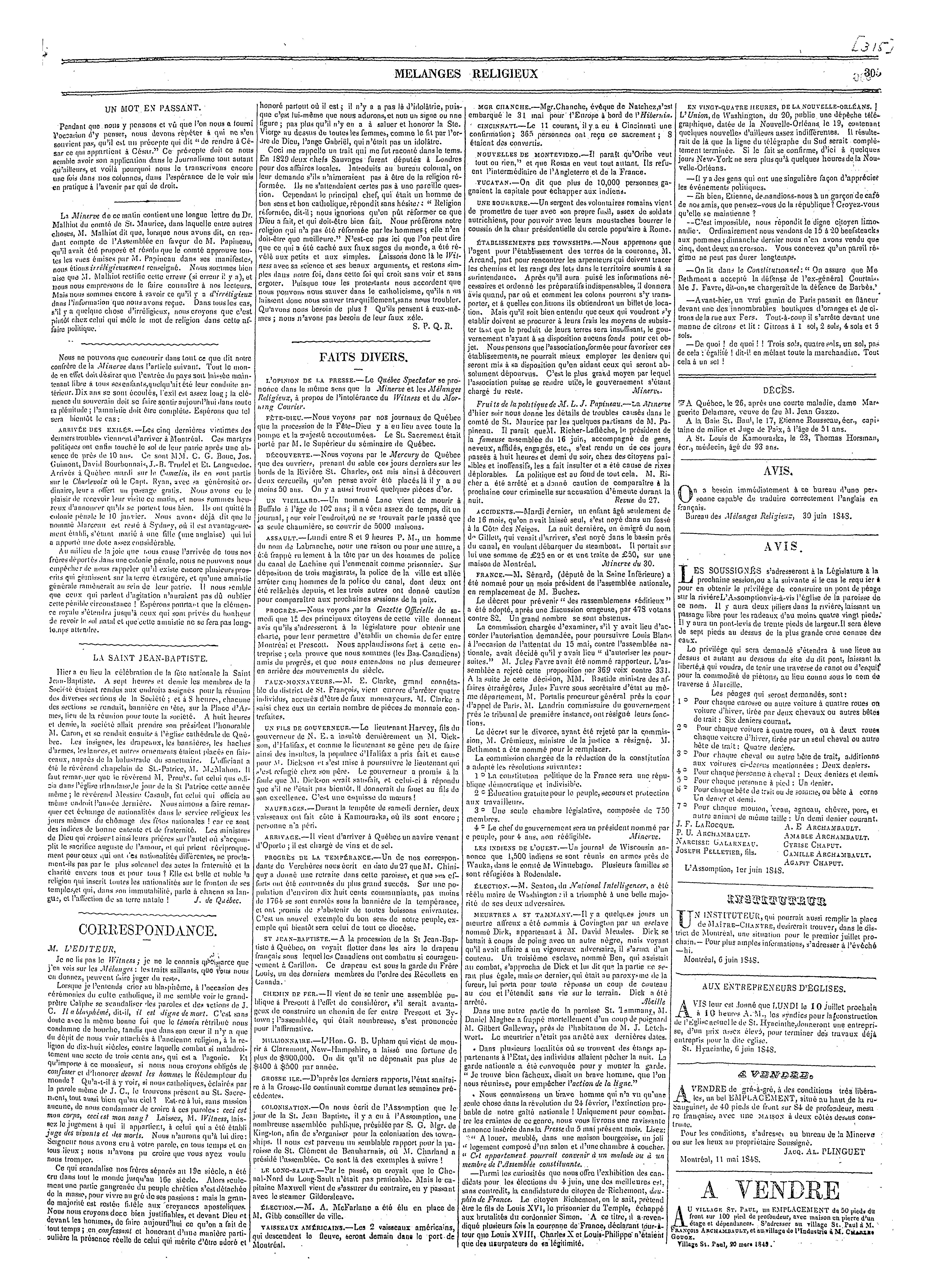 Mélanges religieux, politiques, commerciaux et littéraires [Vol. 11, no 84 (30 juin 1848)]