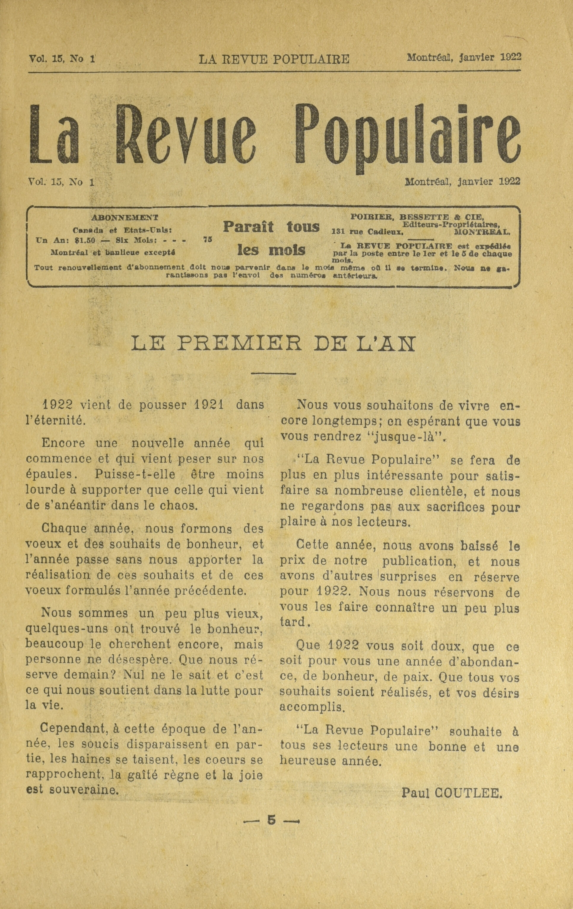 La Revue populaire. : La revue populaire : Vol. 15, No 1 (janvier 1922)
