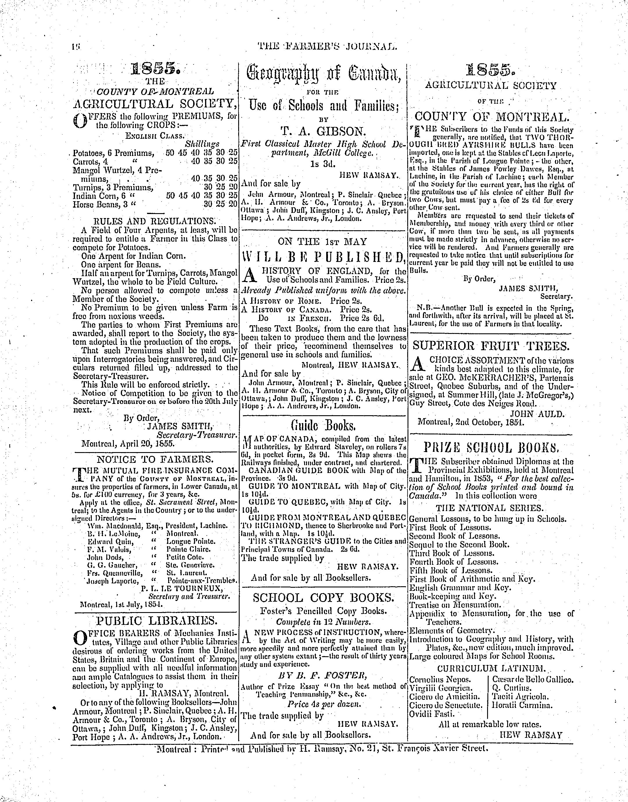 - The farmer's journal and transactions of the Lower Canada Board of Agriculture [Vol. 3, no. 1 (May 1855)]