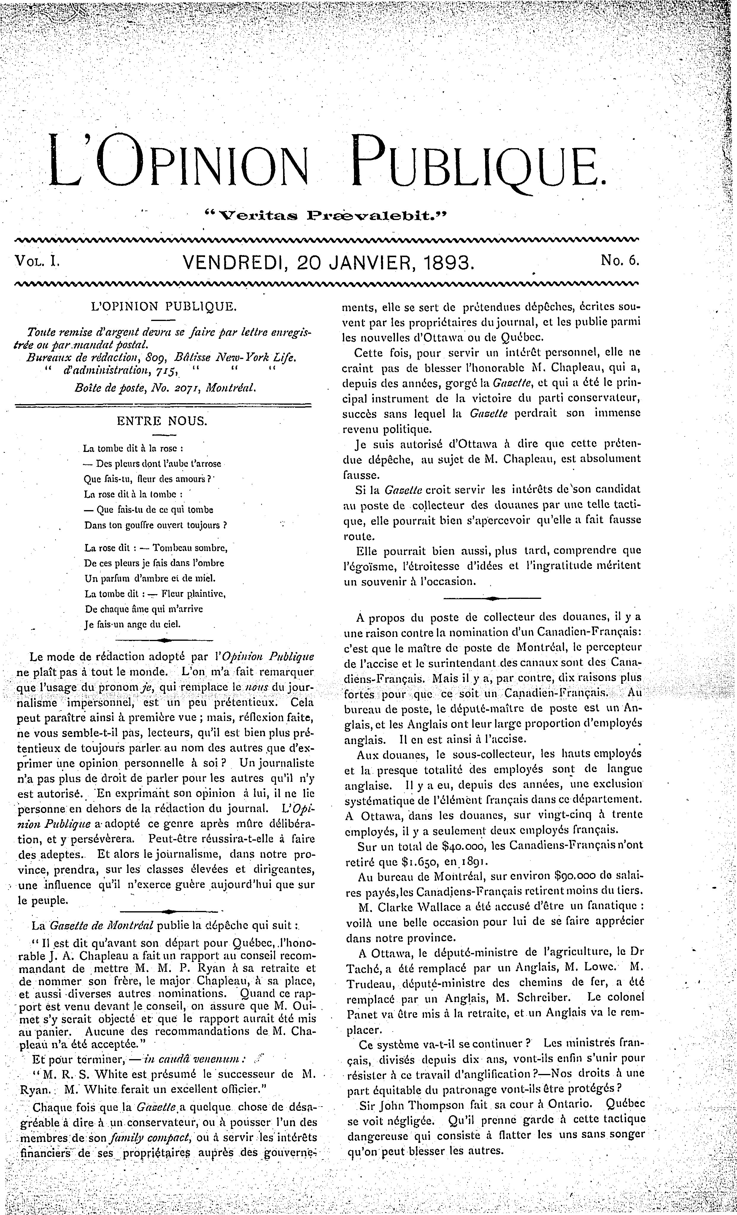 L'opinion publique [Vol. 1, no 6 (20 janv. 1893)]