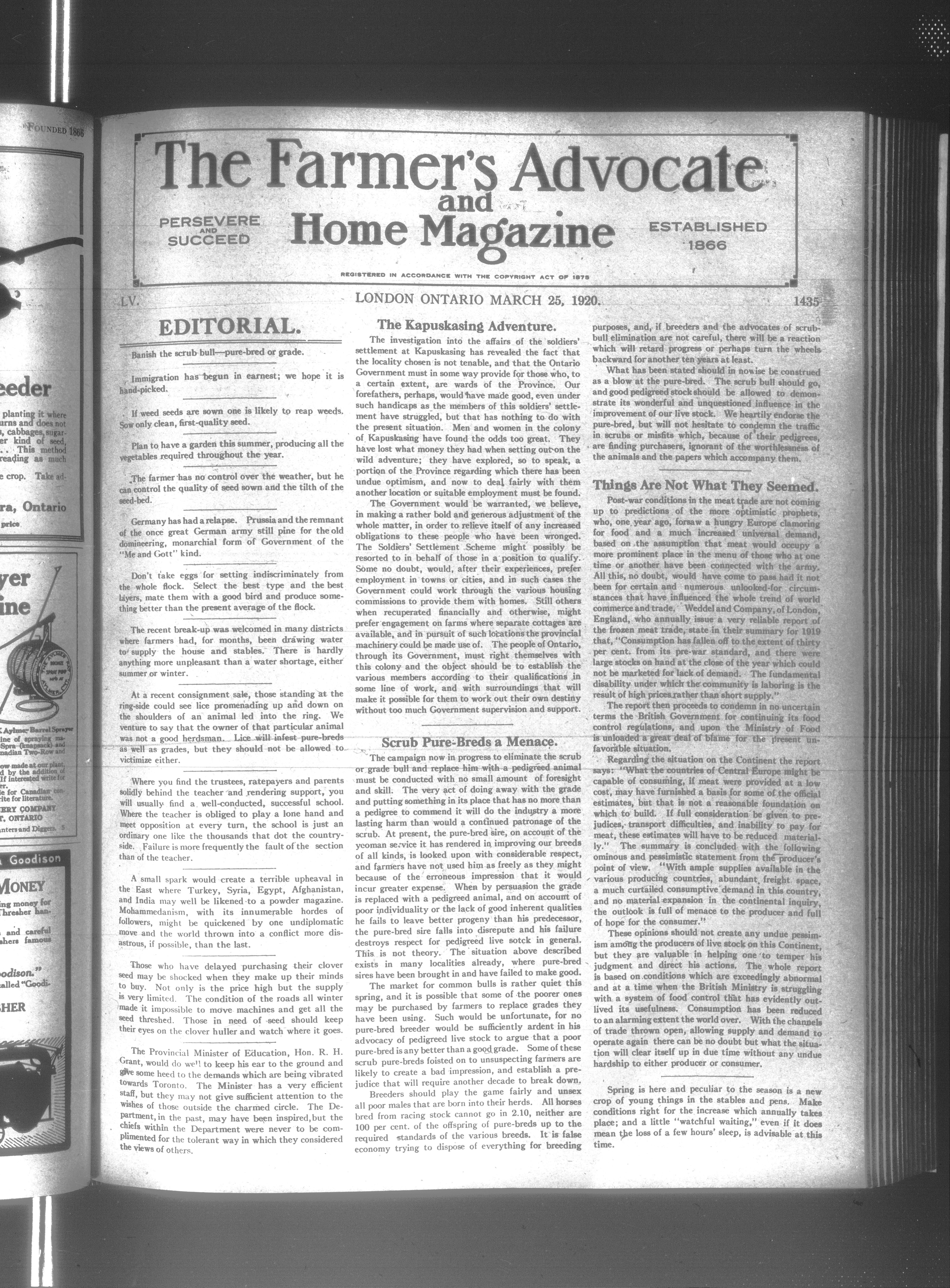 Farmer's Advocate and Home Magazine : Vol. LV, No. 1435 (March 25, 1920)