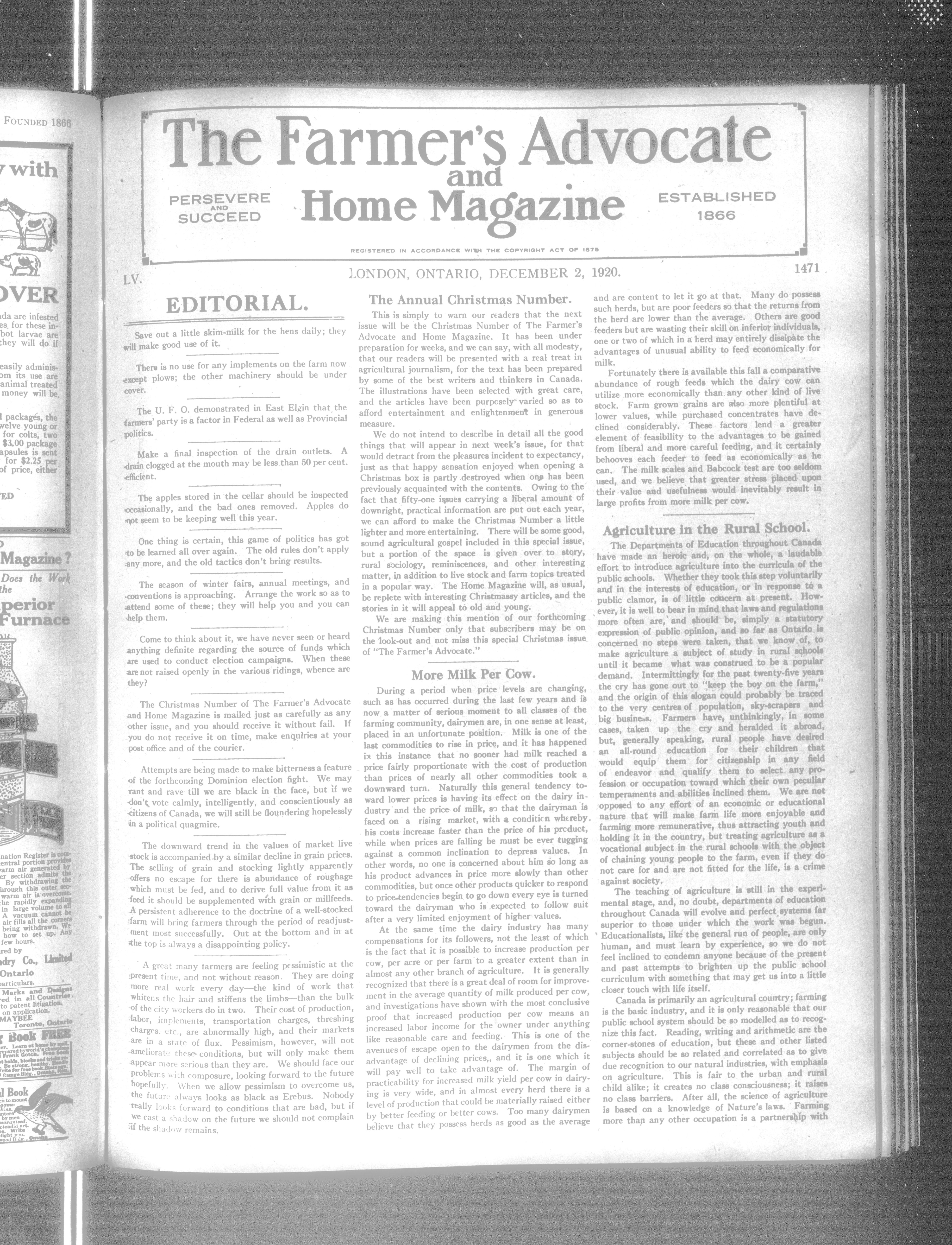 Farmer's Advocate and Home Magazine : Vol. LV, No. 1471 (December 2, 1920)
