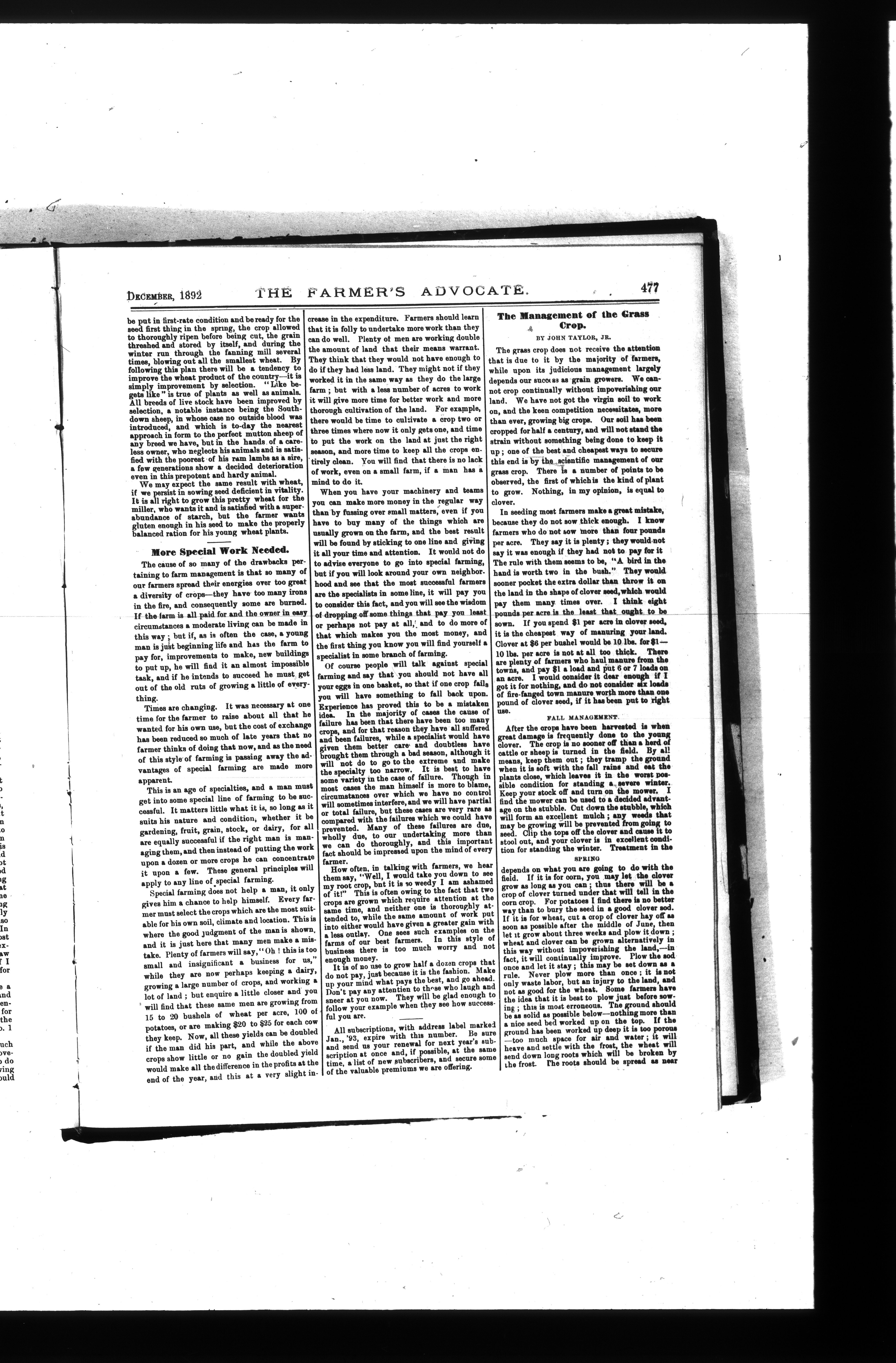 Farmer's Advocate and Home Magazine : Vol. XXVII, No. 324 (December 1892)