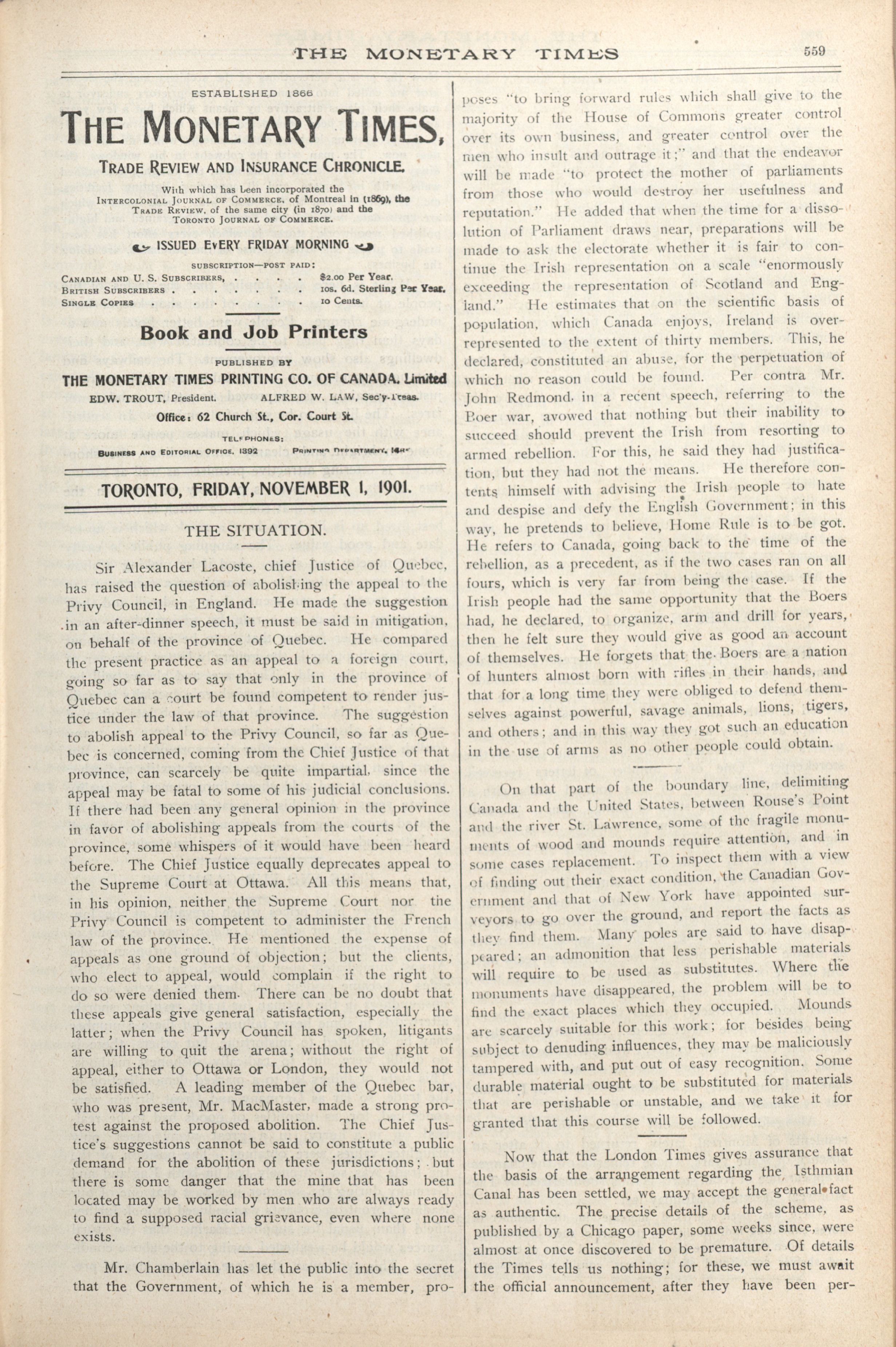 - The Monetary Times, trade review and insurance chronicle. : Vol. XXXV No. 18 (November 1, 1901)
