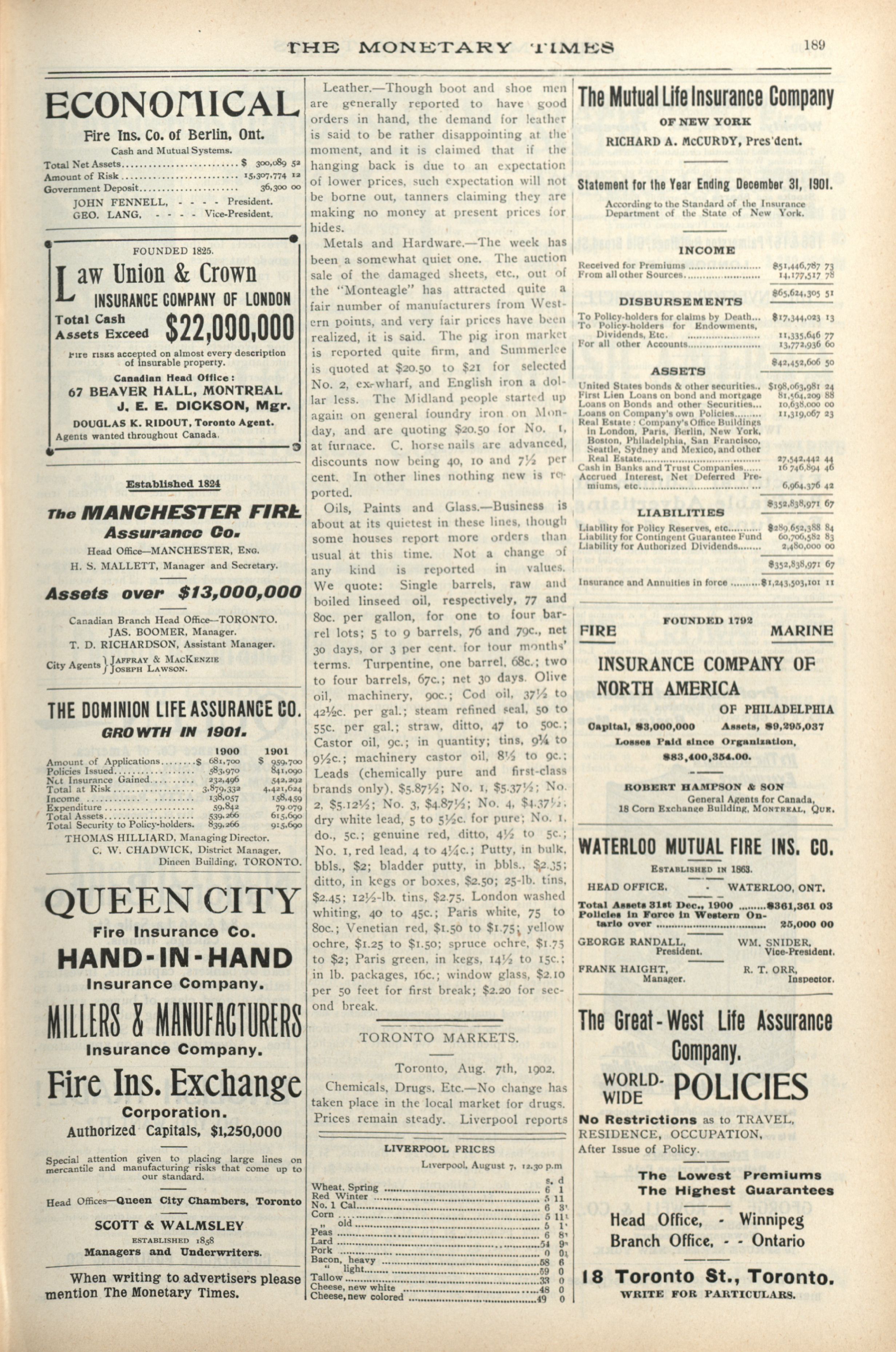 - The Monetary Times, trade review and insurance chronicle. : 36th Year. No. 6. (August 8, 1902)