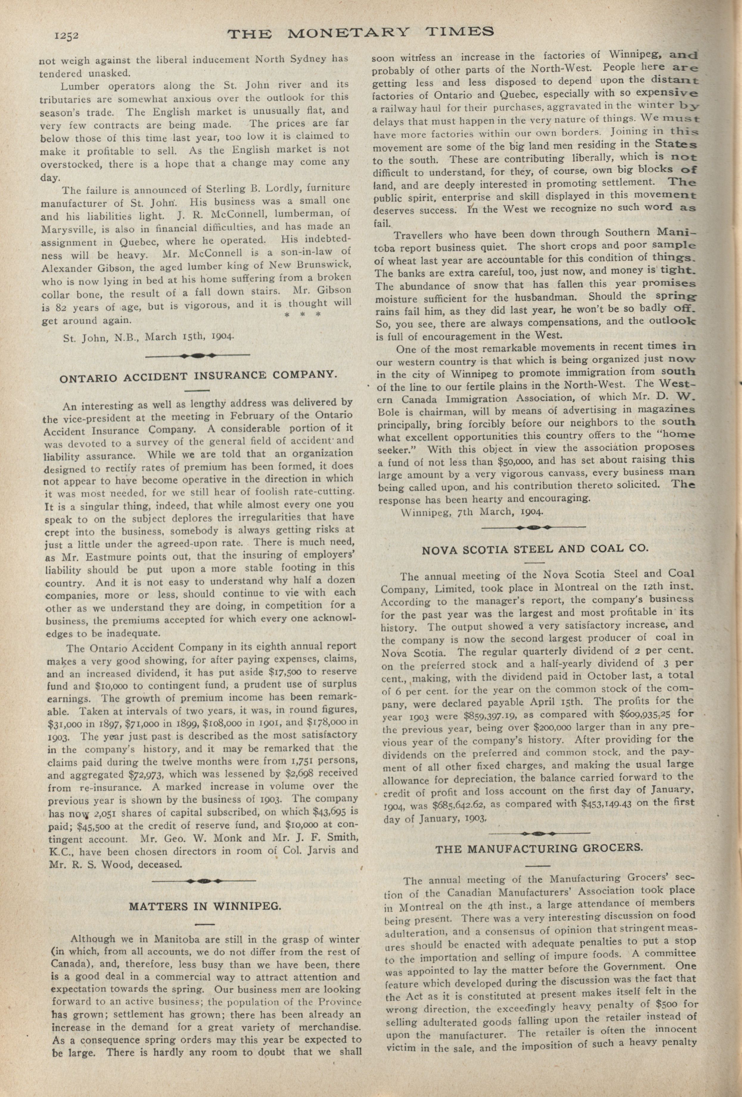- The Monetary Times, trade review and insurance chronicle. : 37th Year. No. 38. (March 18, 1904)