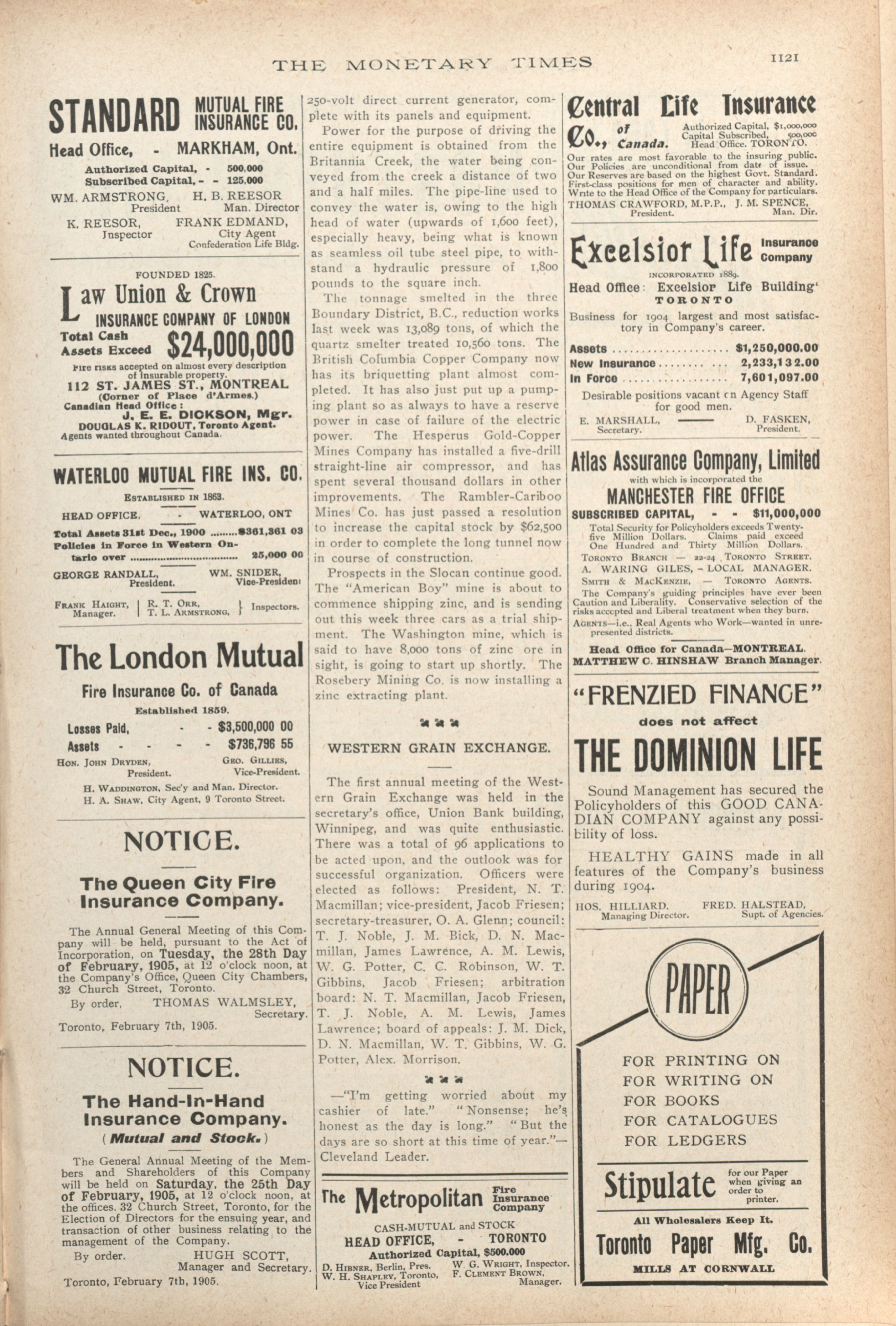- The Monetary Times, trade review and insurance chronicle. : 38th Year No. 34. (February 17, 1905)