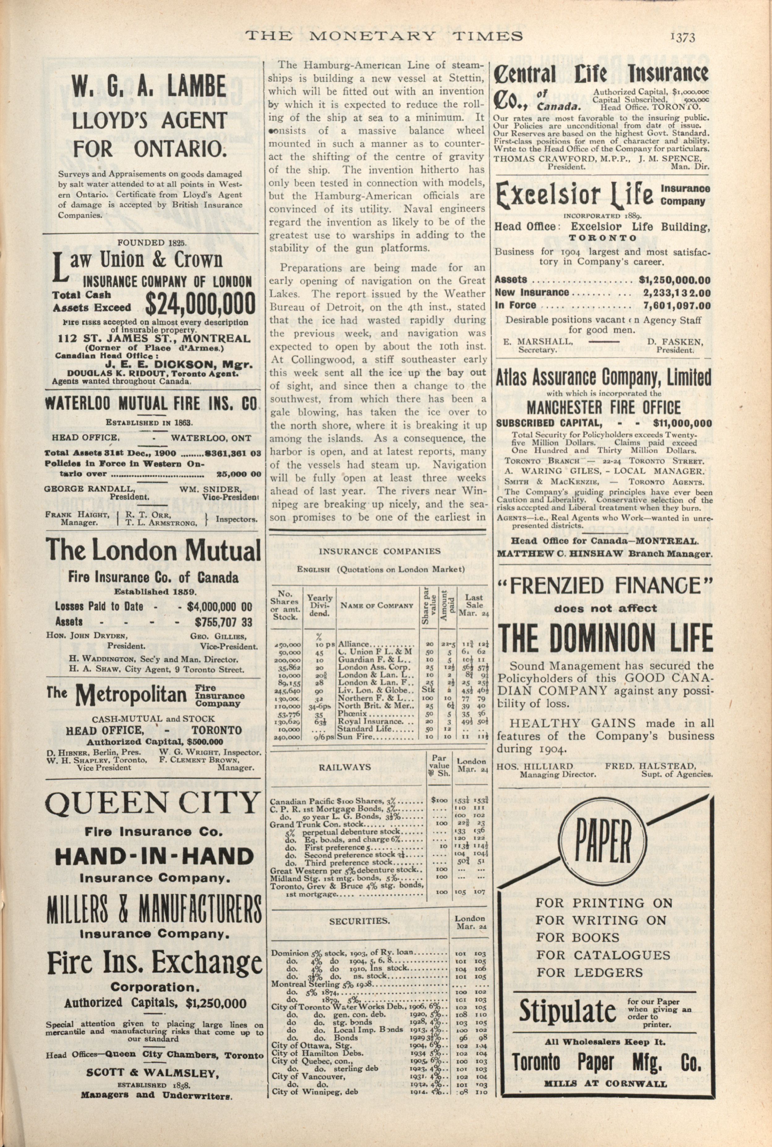 - The Monetary Times, trade review and insurance chronicle. : 38th Year No. 41. (April 7, 1905)