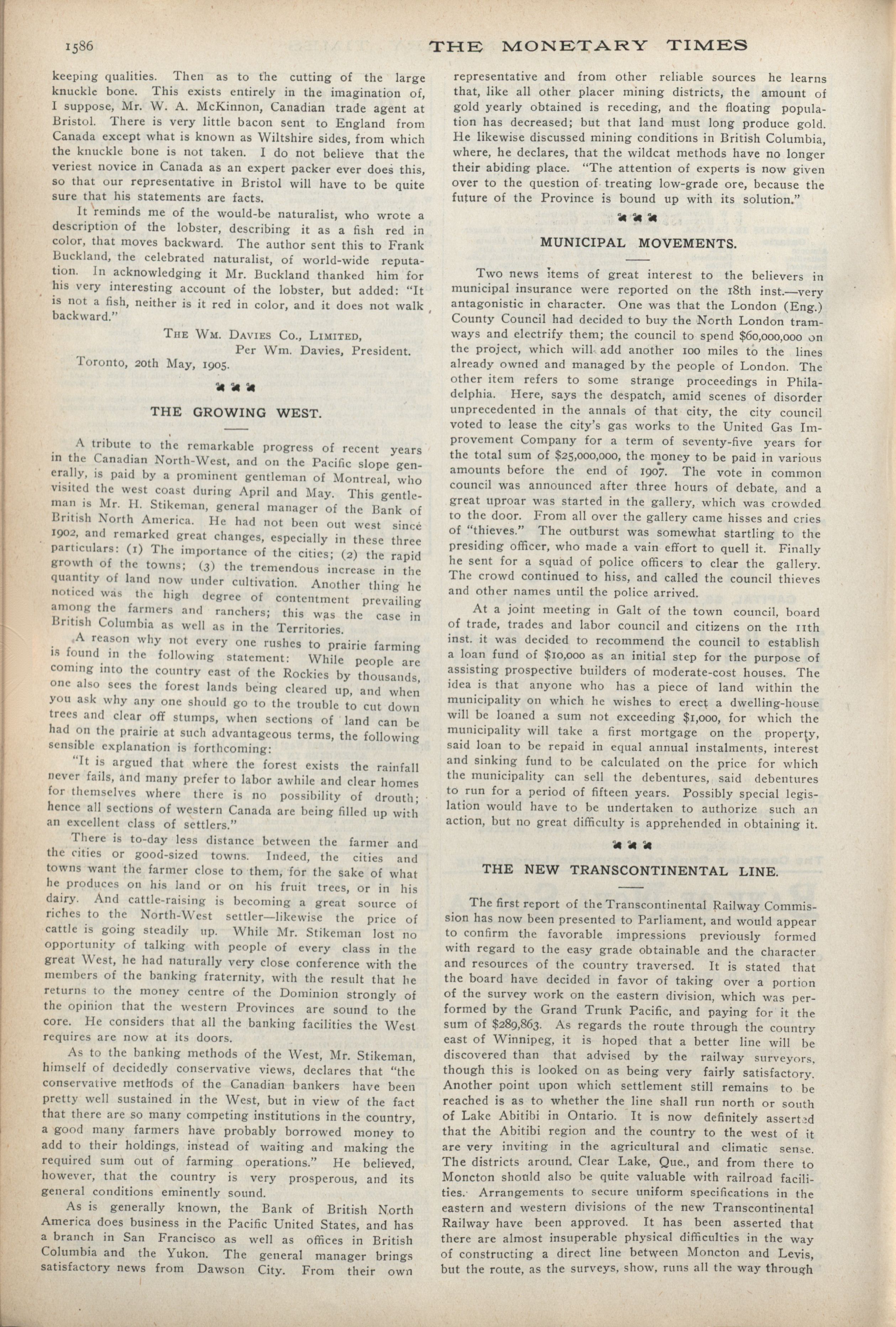- The Monetary Times, trade review and insurance chronicle. : 38th Year No. 48. (May 26, 1905)