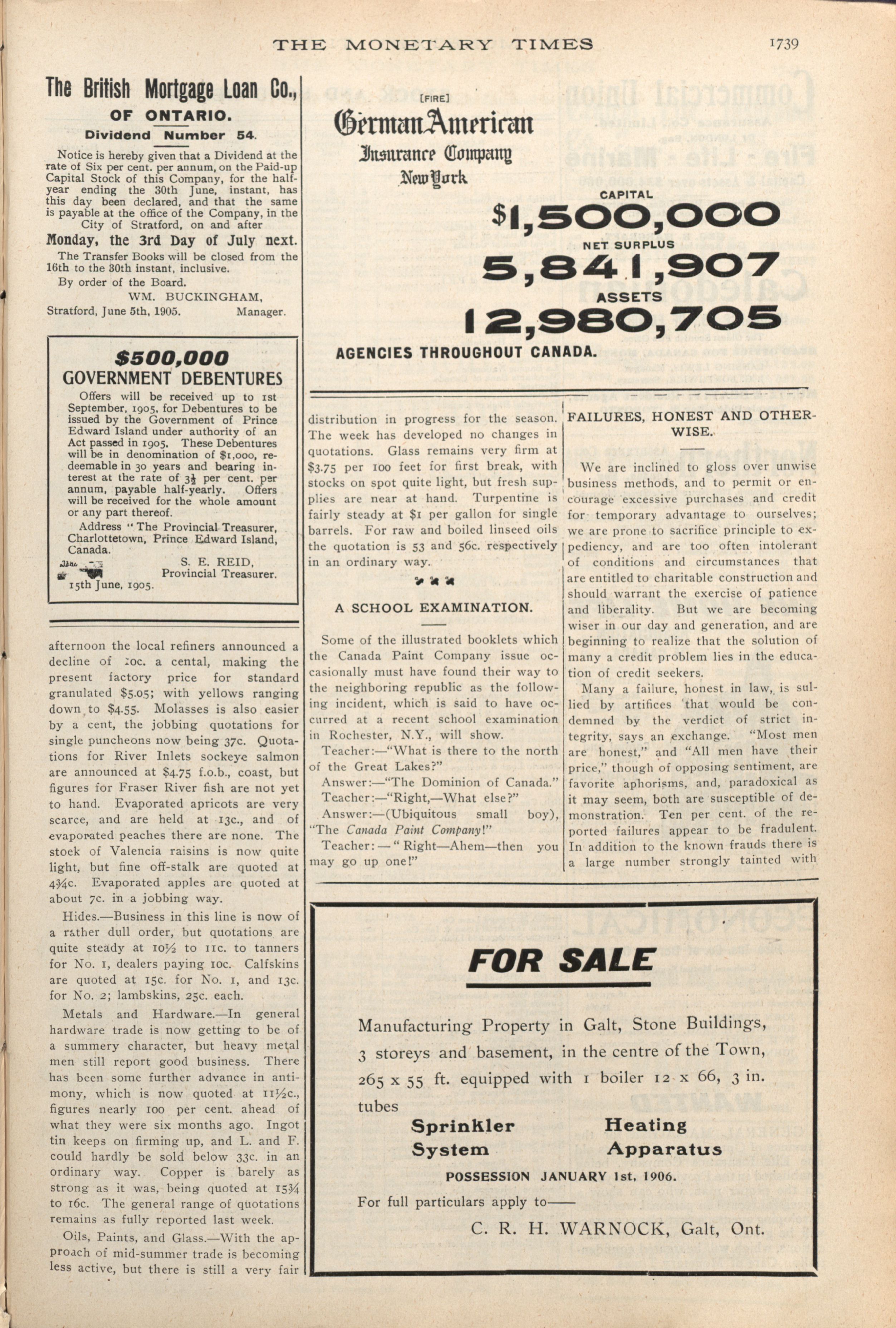 - The Monetary Times, trade review and insurance chronicle. : 38th Year No. 52. (June 23, 1905)