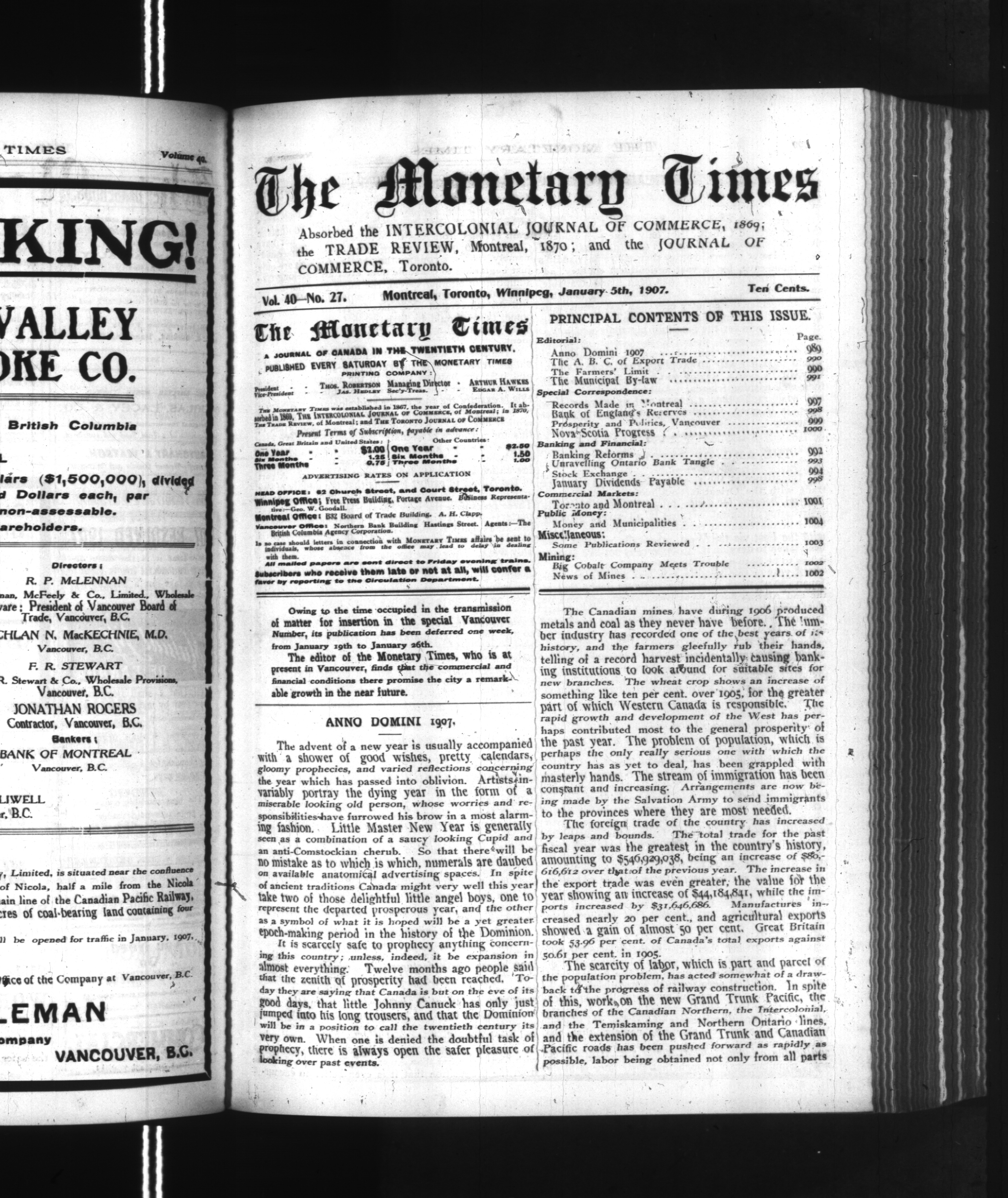The monetary times, trade review and insurance chronicle : Vol. 40, No. 27 (January 5, 1907)