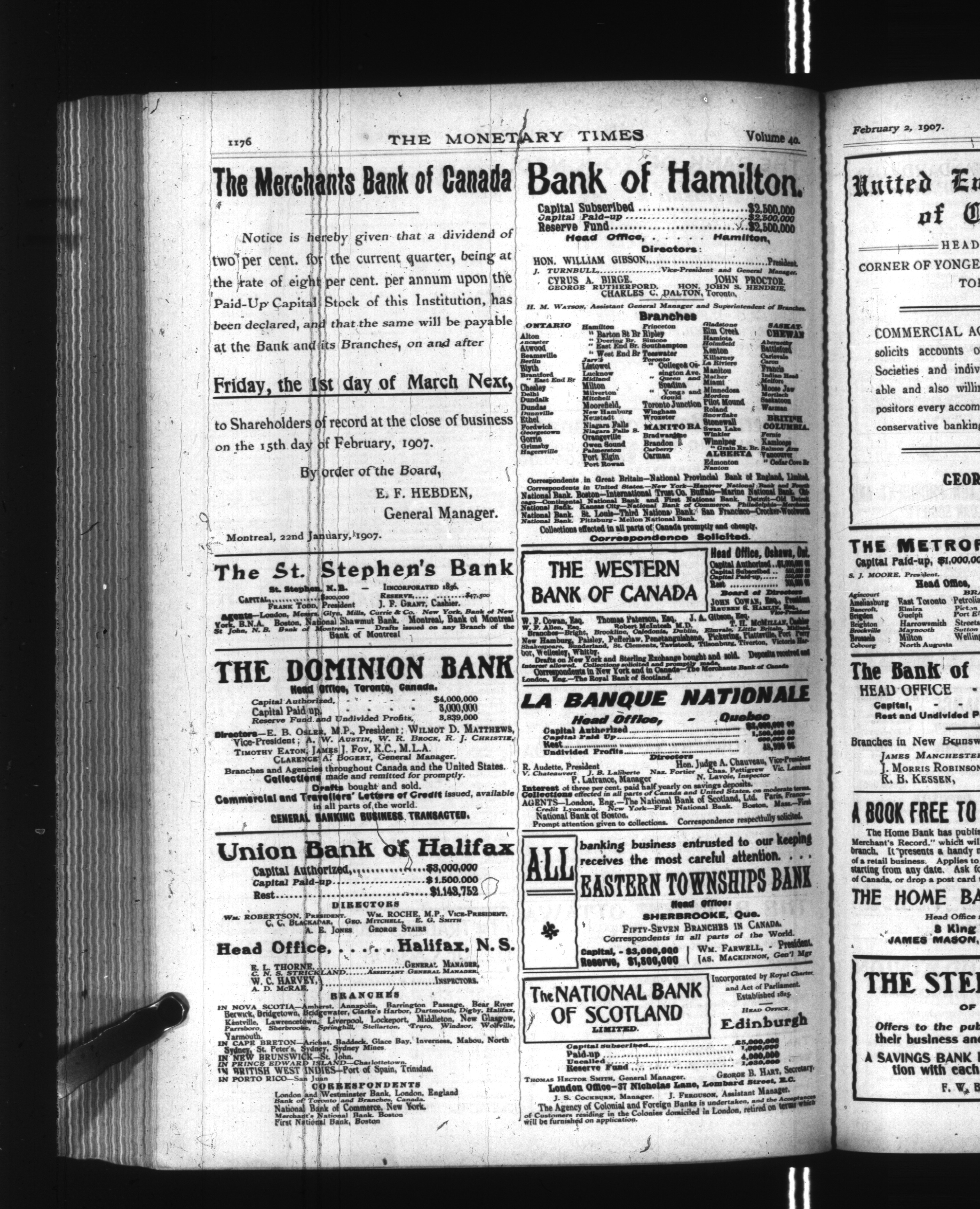 The monetary times, trade review and insurance chronicle : Vol. 40, No. 31 (February 2, 1907)