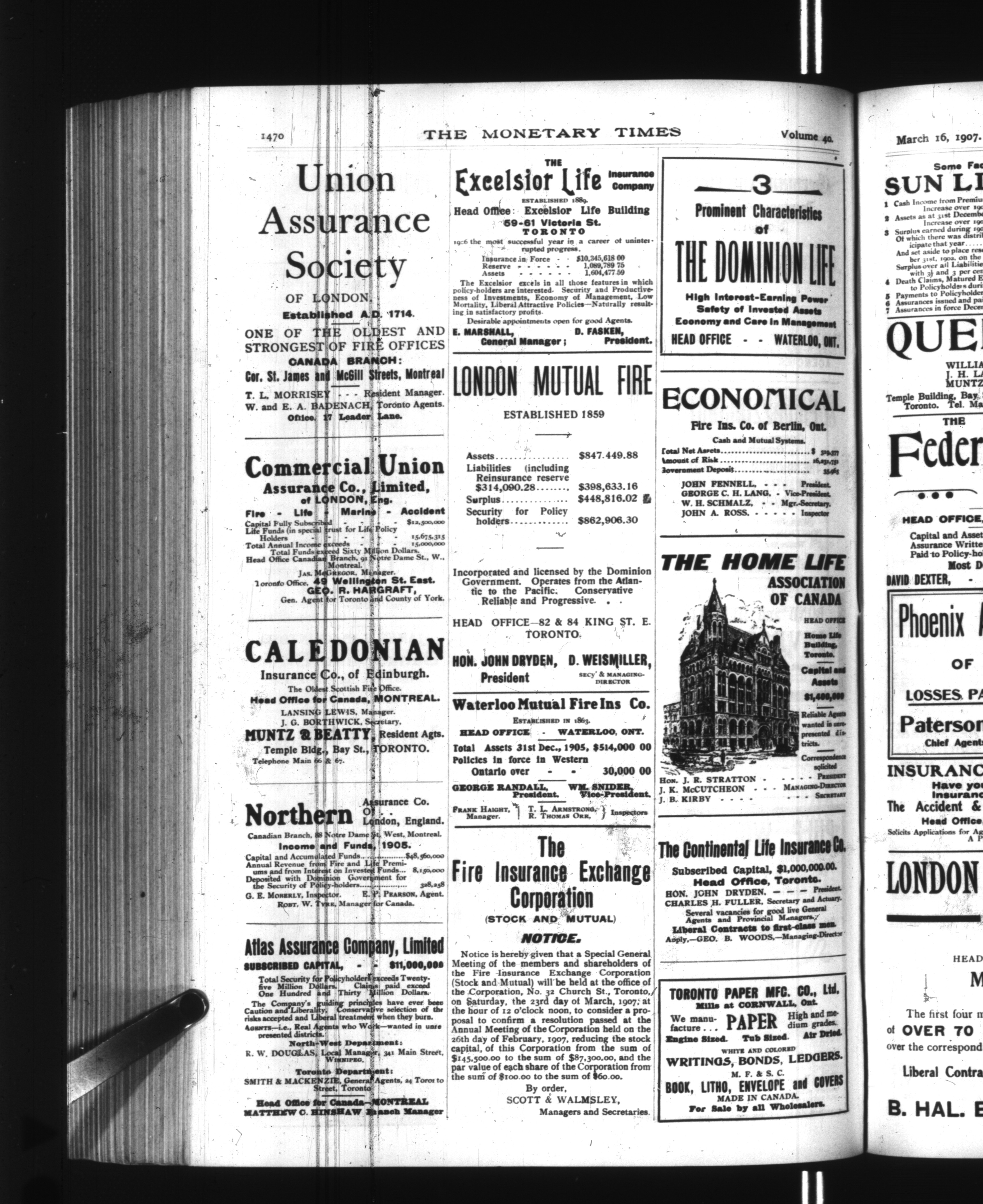 The monetary times, trade review and insurance chronicle : Vol. 40, No. 37 (March 16, 1907)