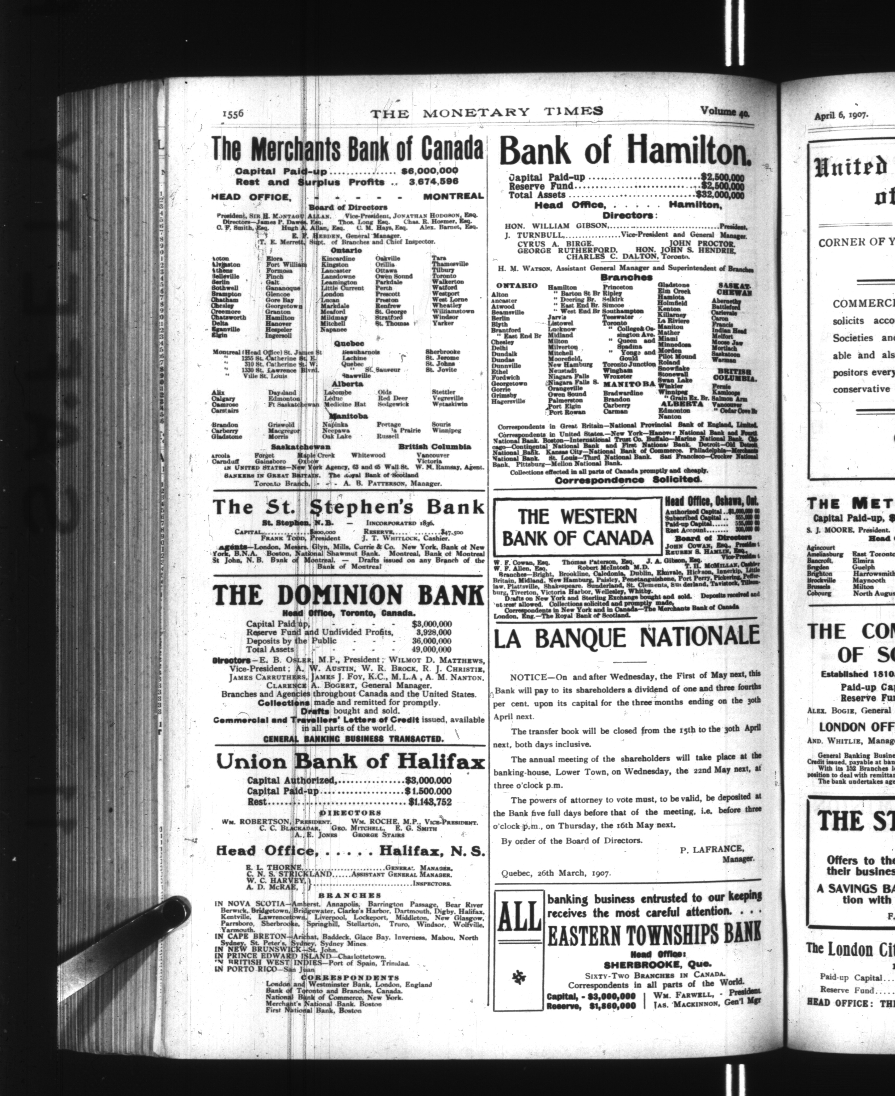 The monetary times, trade review and insurance chronicle : Vol. 40, No. 40 (April 6, 1907)