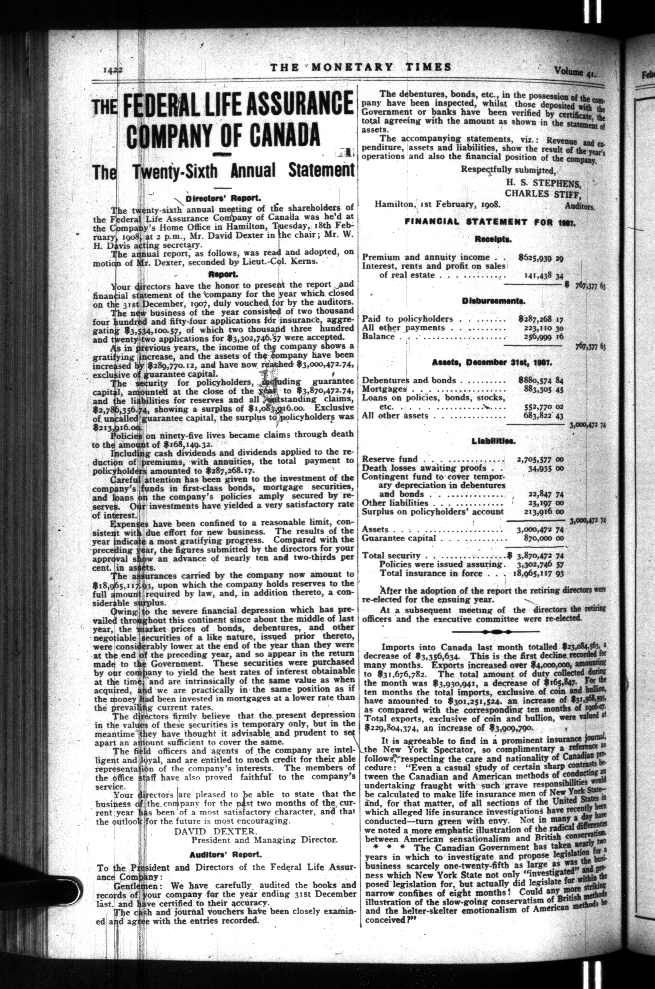 The monetary times, trade review and insurance chronicle : Vol. 41, No. 34 (Feb. 22, 1908)