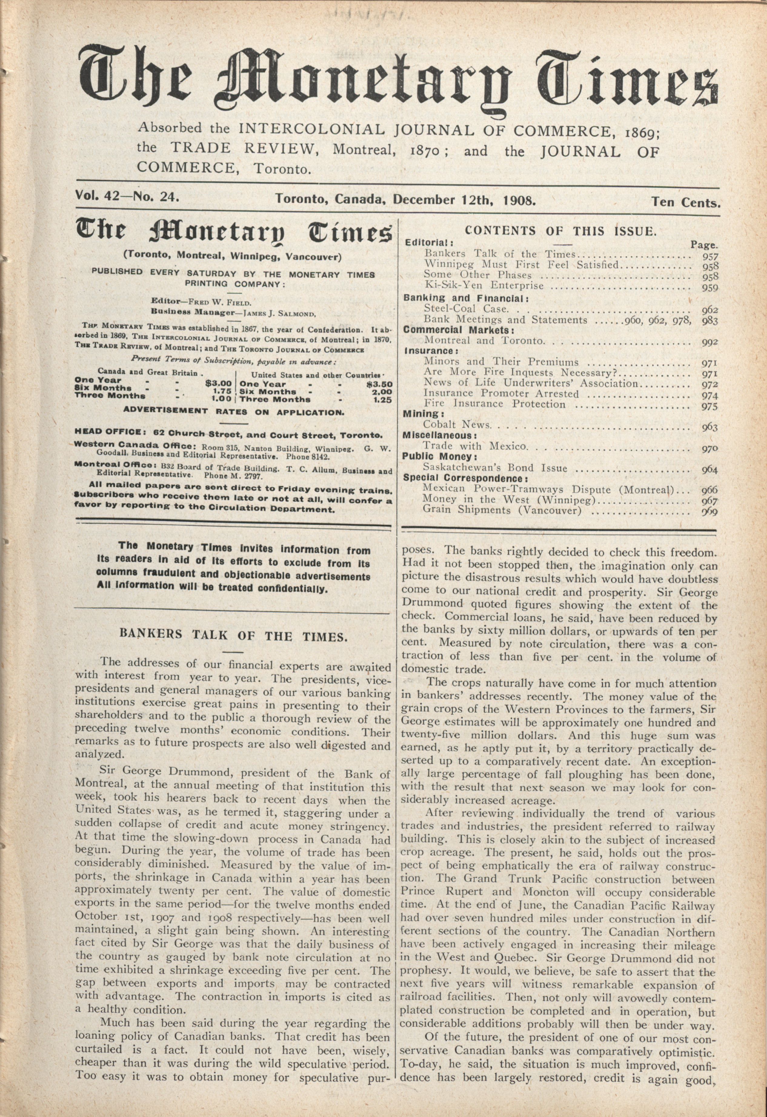 - The Monetary Times, trade review and insurance chronicle. : Vol. 42 No. 24. (December 12th, 1908.)