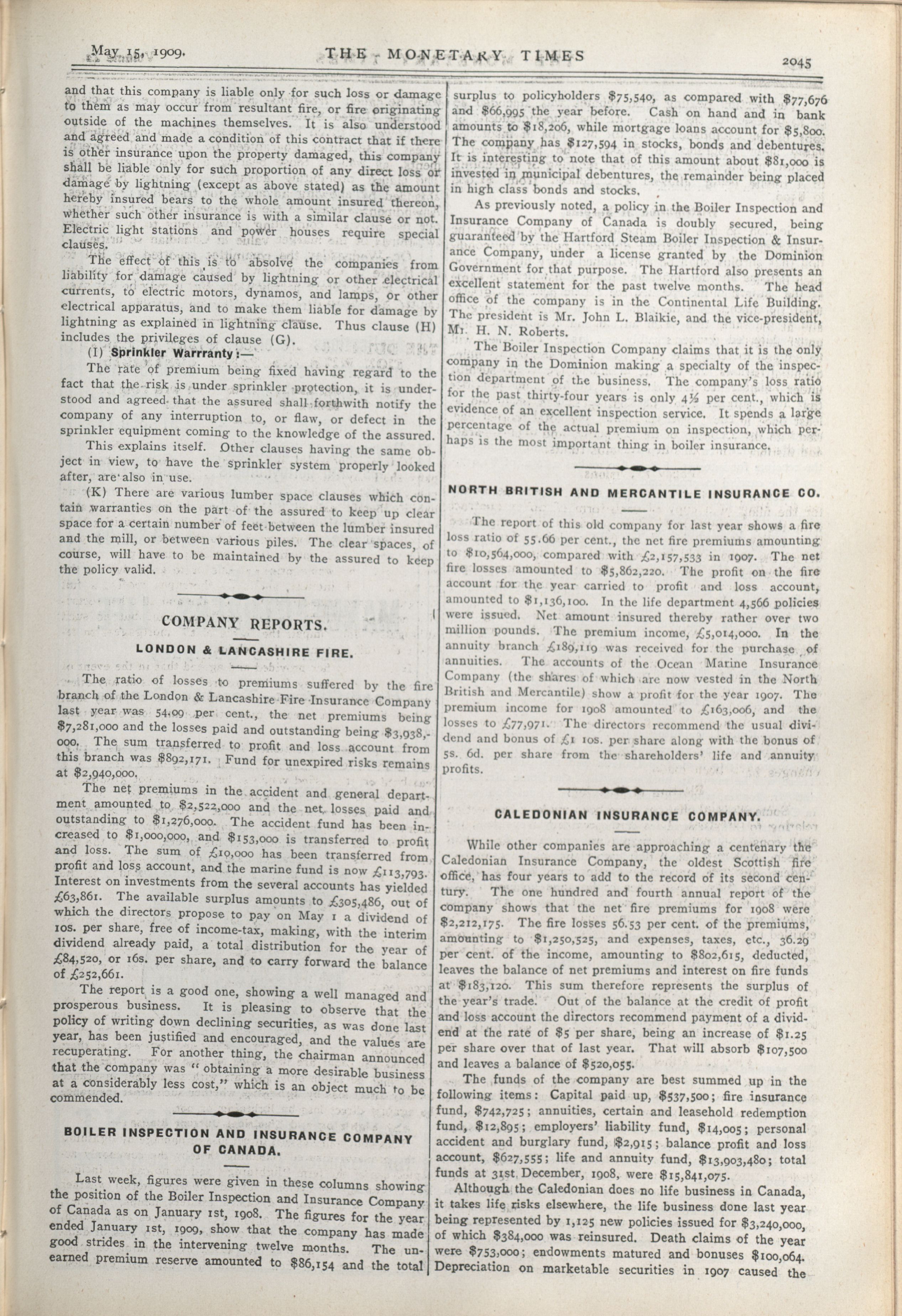 - The Monetary Times, trade review and insurance chronicle. : Vol. 42 No. 46. (May 15th, 1909.)