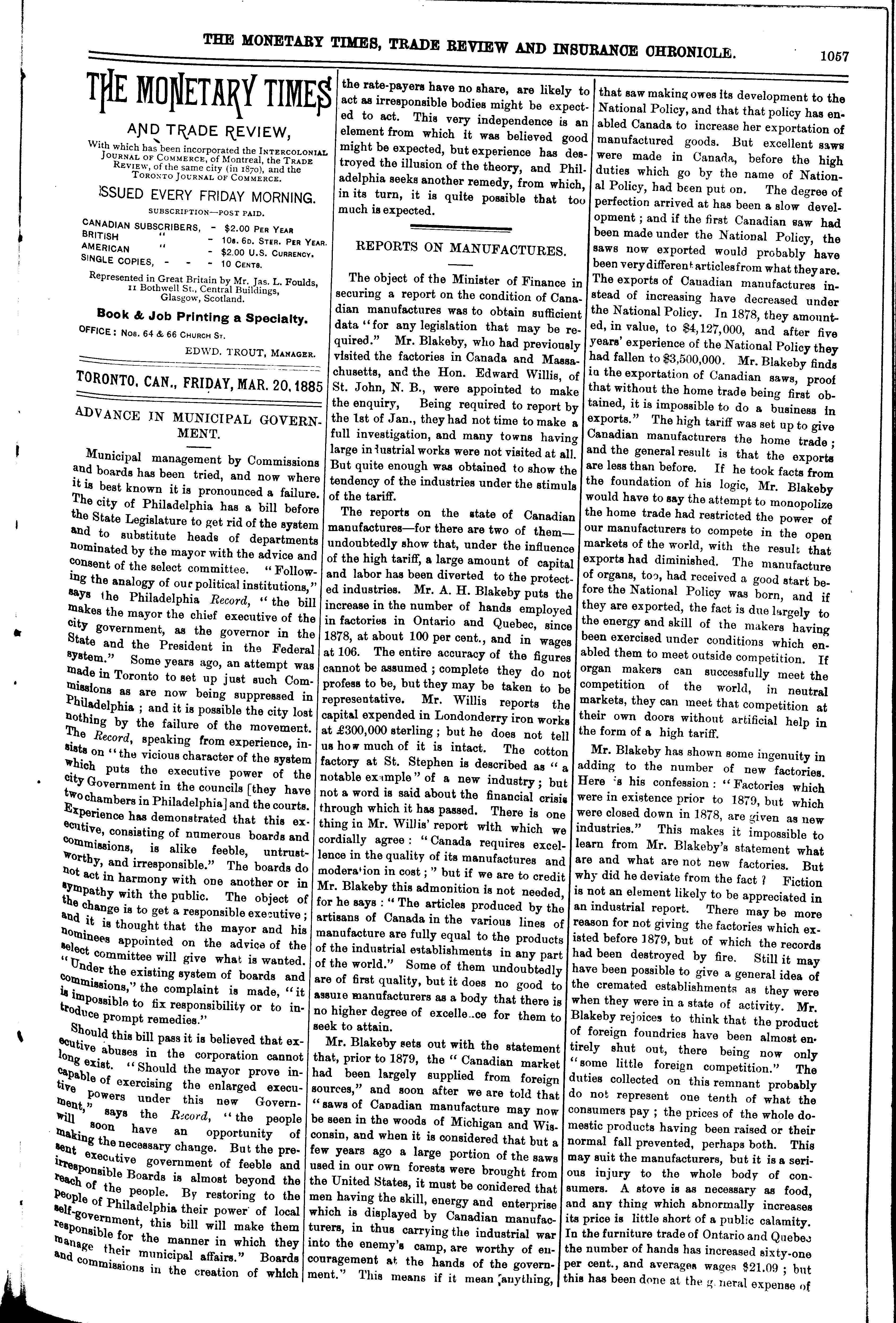 The monetary times, trade review and insurance chronicle : [Vol. 18, no. 38 (Mar. 20, 1885)]
