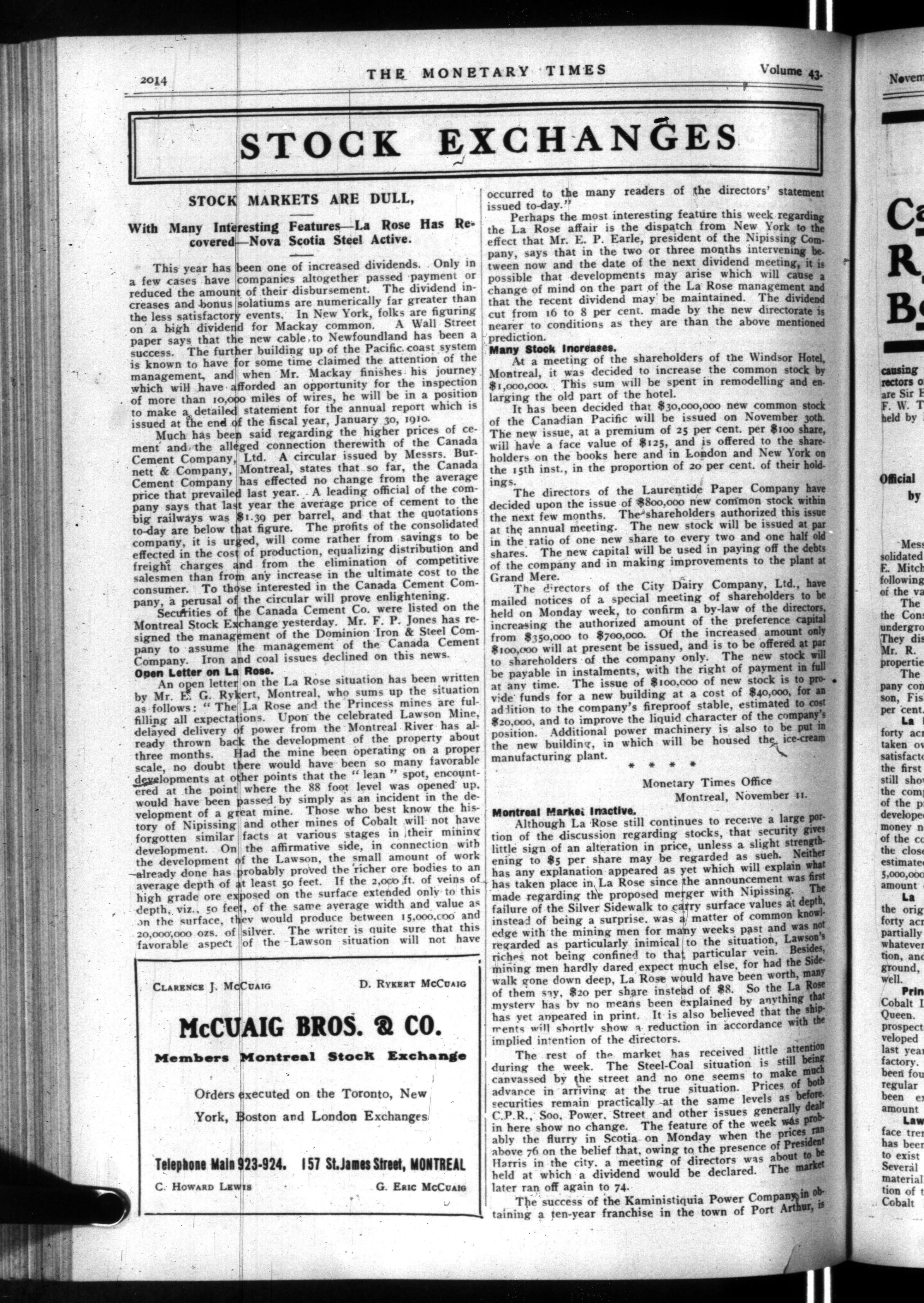 The monetary times, trade review and insurance chronicle : Vol. 43, No. 20 (November 13, 1909)
