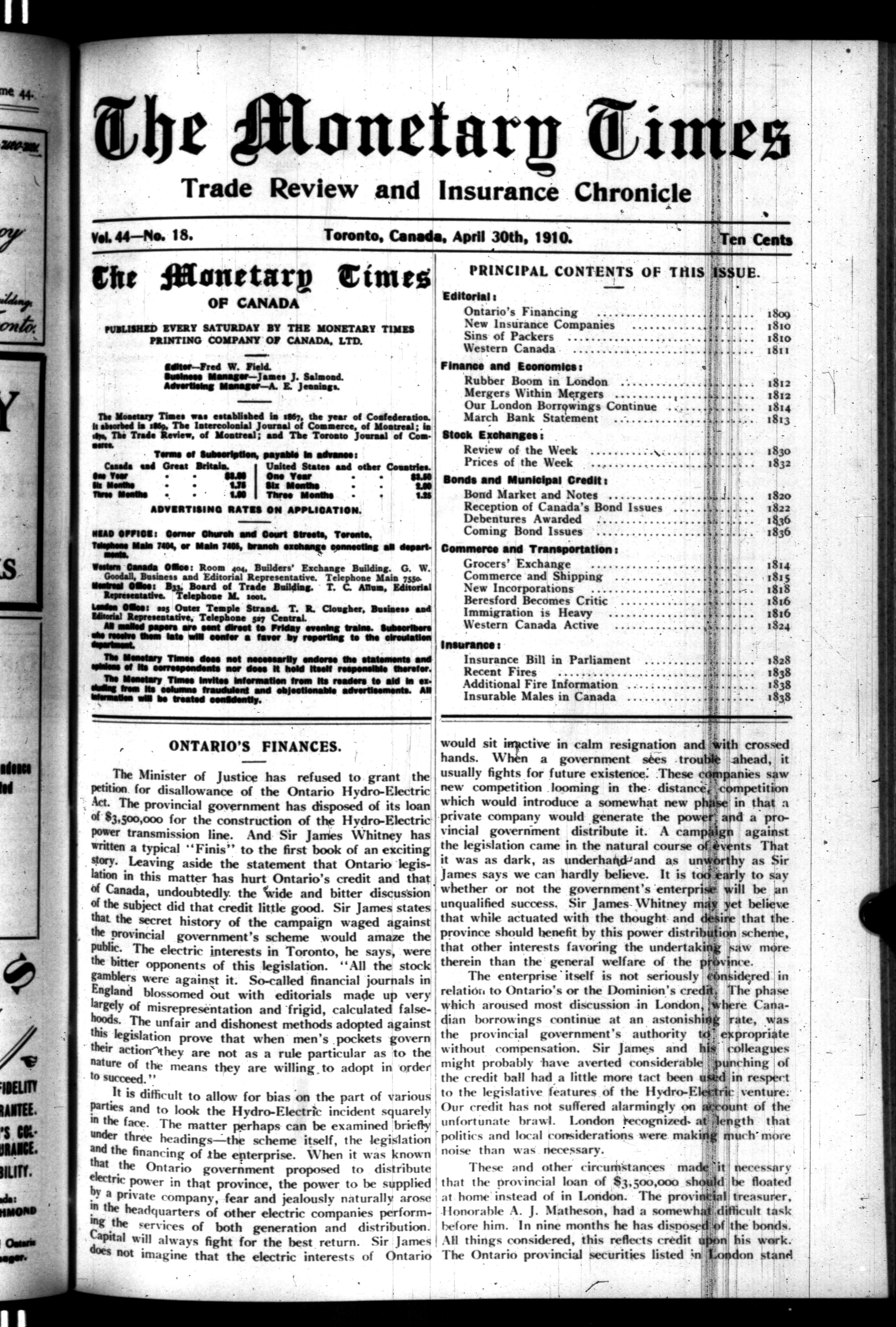 The monetary times, trade review and insurance chronicle : Vol. 44, No. 18 (April 30, 1910)