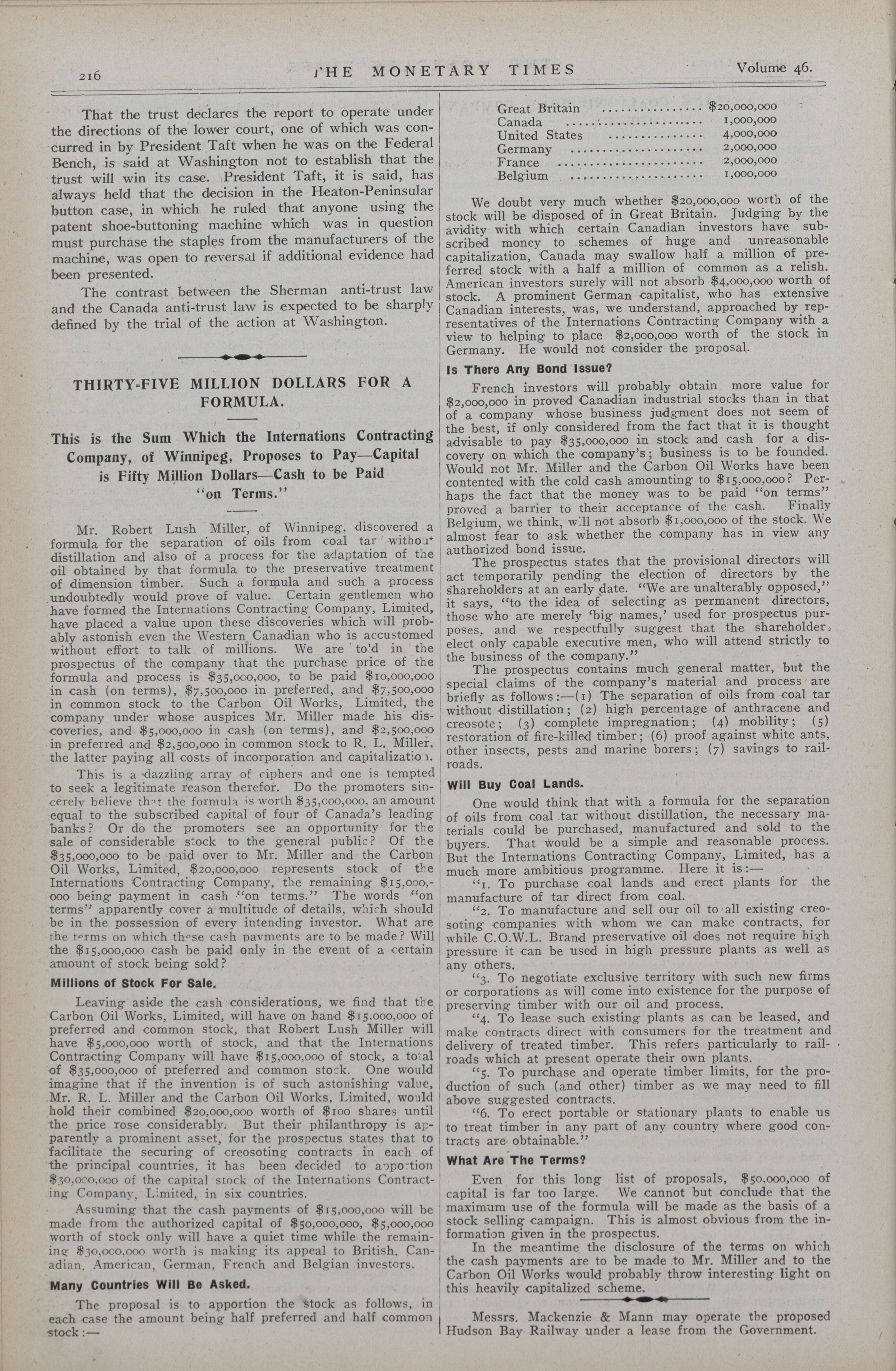 The Monetary Times, trade review and insurance chronicle. : Vol. 46 No. 2 (January 14th, 1911.)