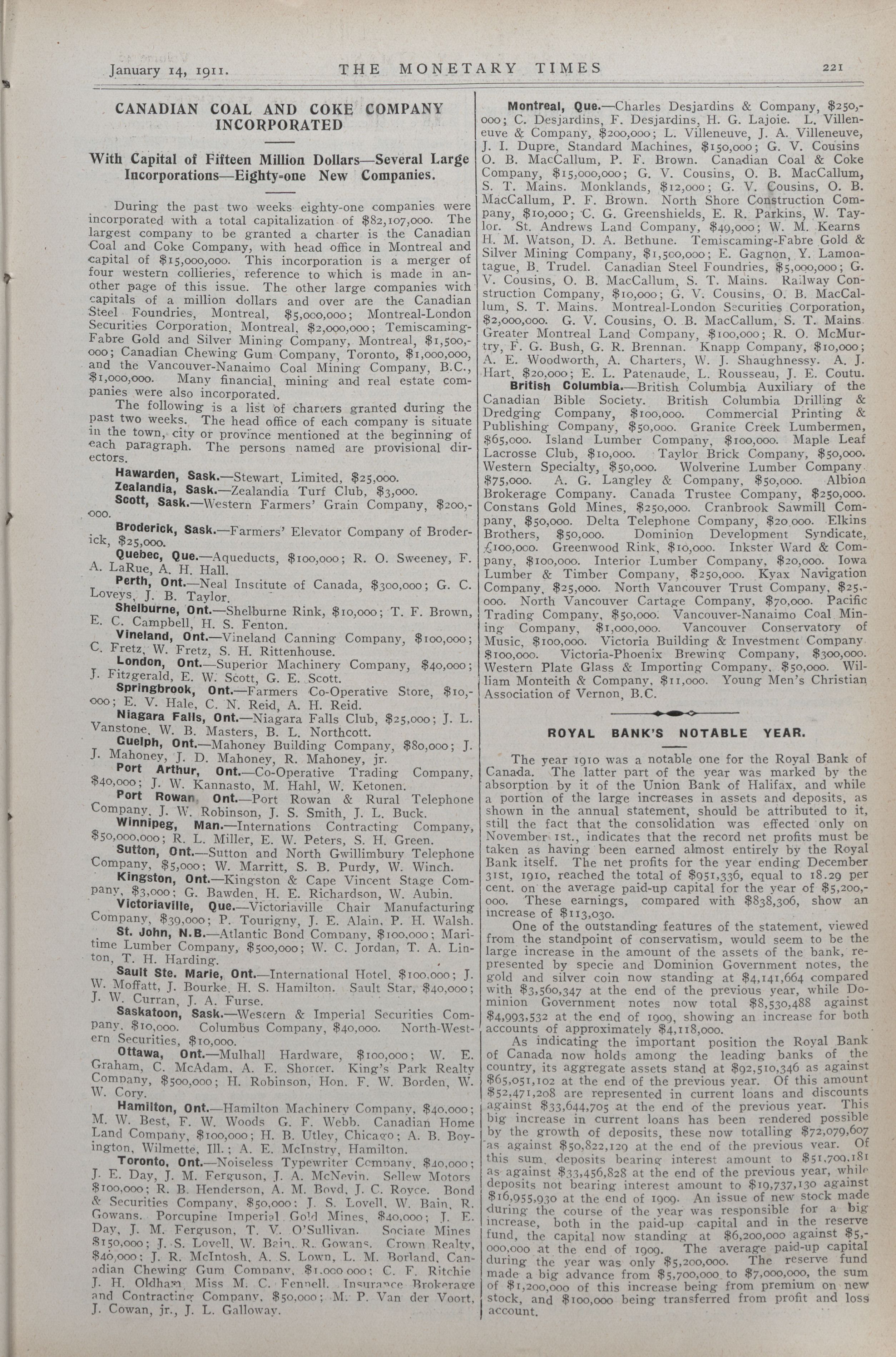 The Monetary Times, trade review and insurance chronicle. : Vol. 46 No. 2 (January 14th, 1911.)