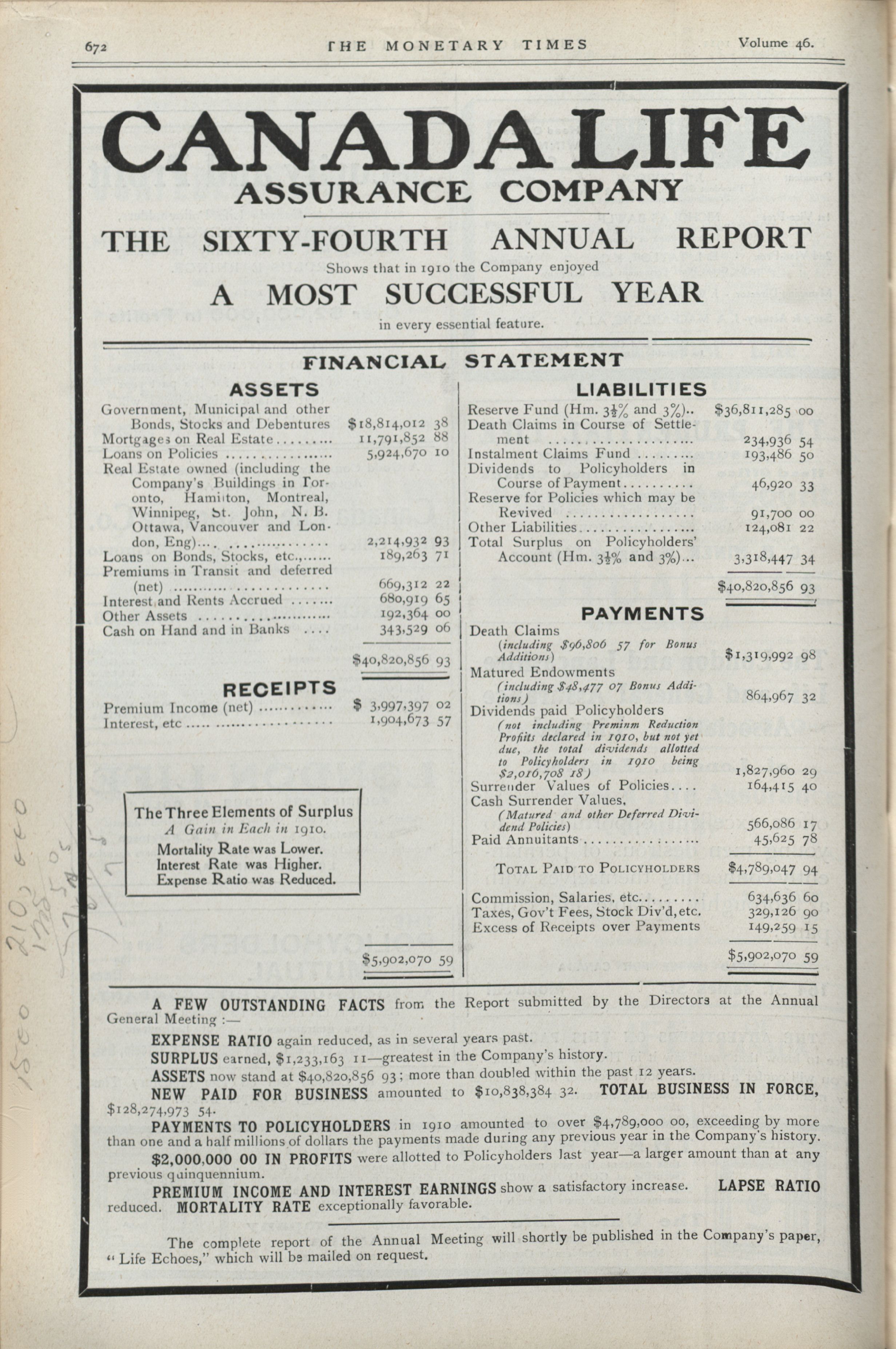 The Monetary Times, trade review and insurance chronicle. : Vol. 46 No. 6 (February 11th, 1911.)