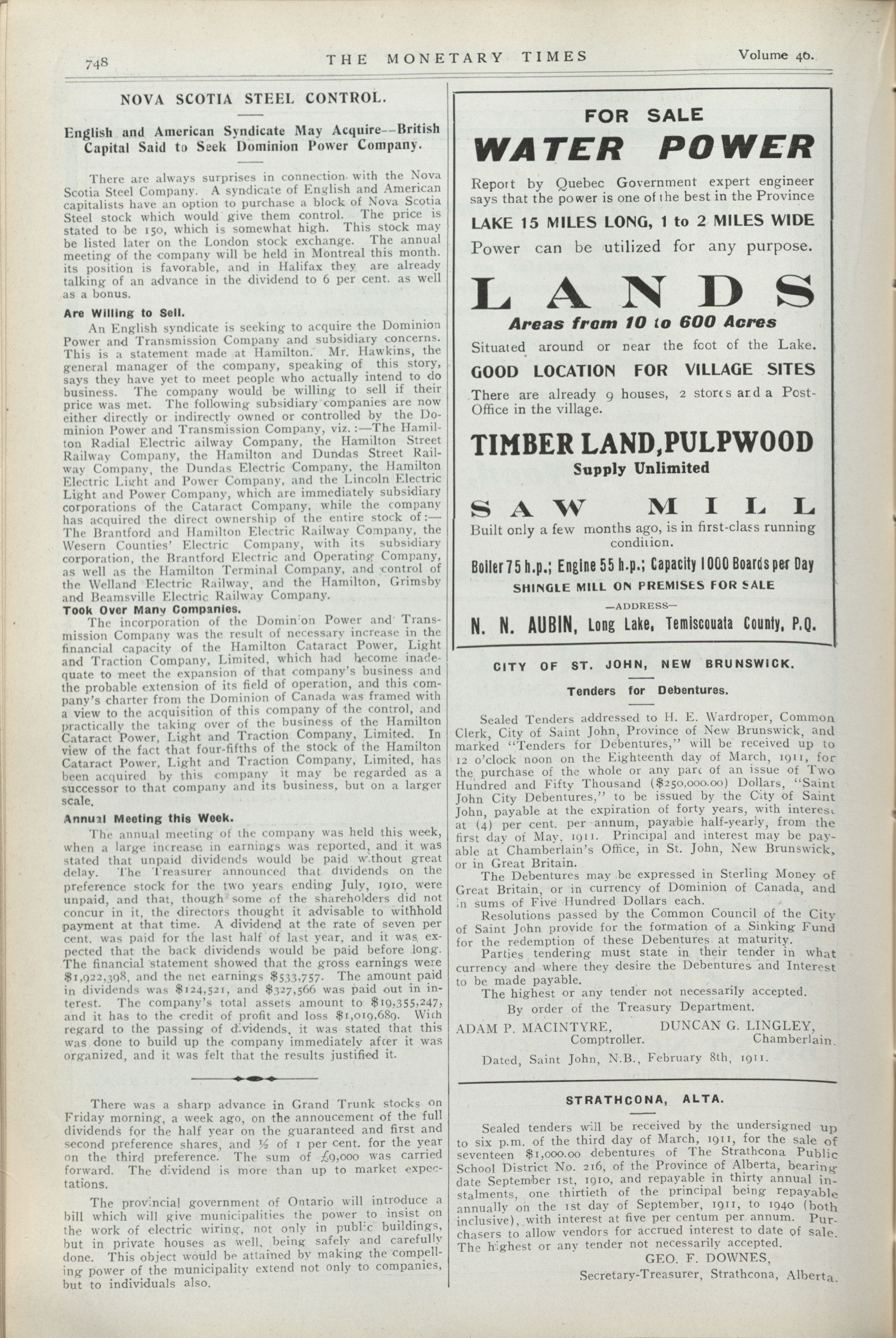 The Monetary Times, trade review and insurance chronicle. : Vol. 46 No. 7 (February 18th, 1911.)