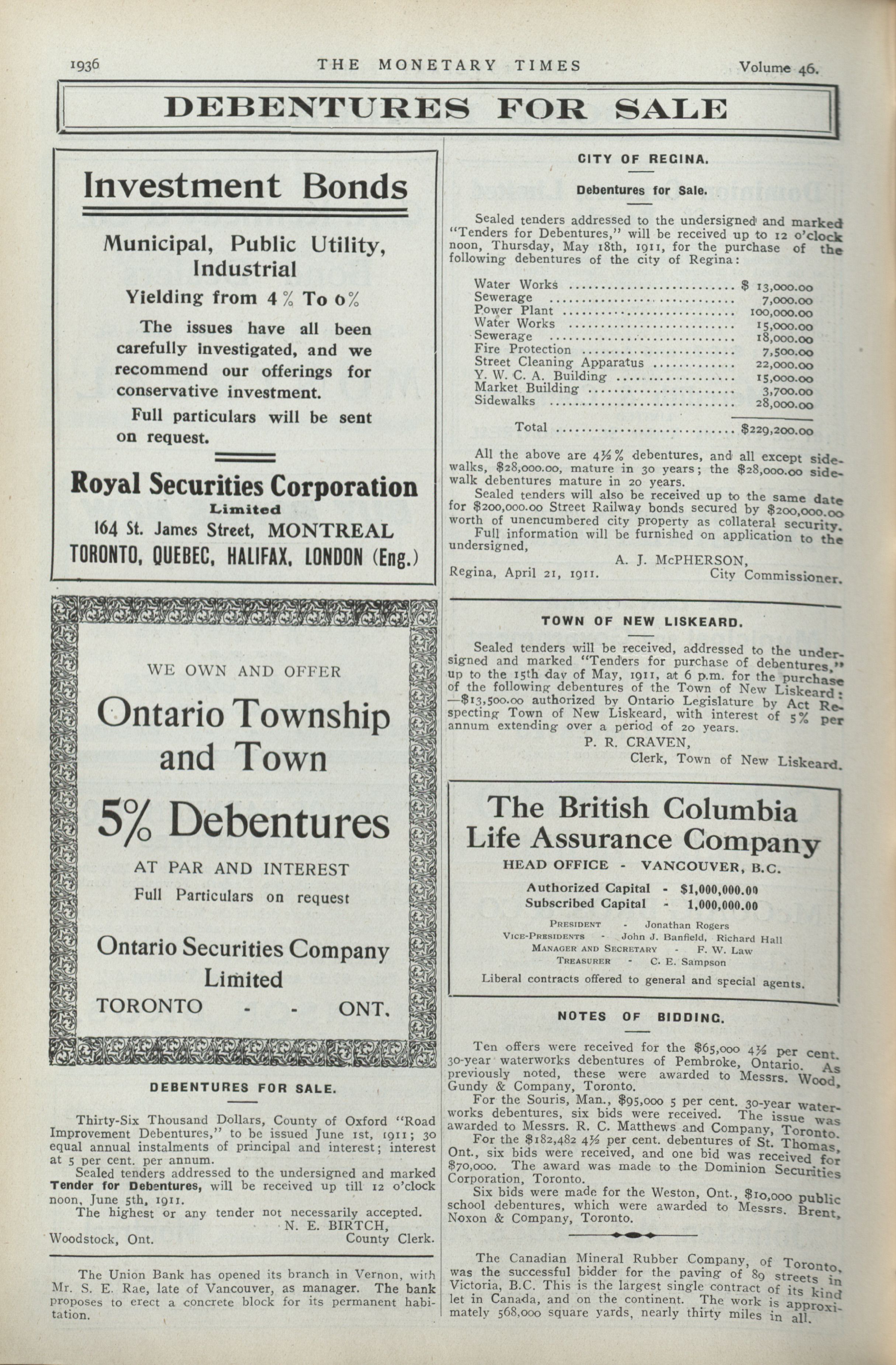- The Monetary Times, trade review and insurance chronicle. : Vol. 46 No. 19 (May 13th, 1911.)