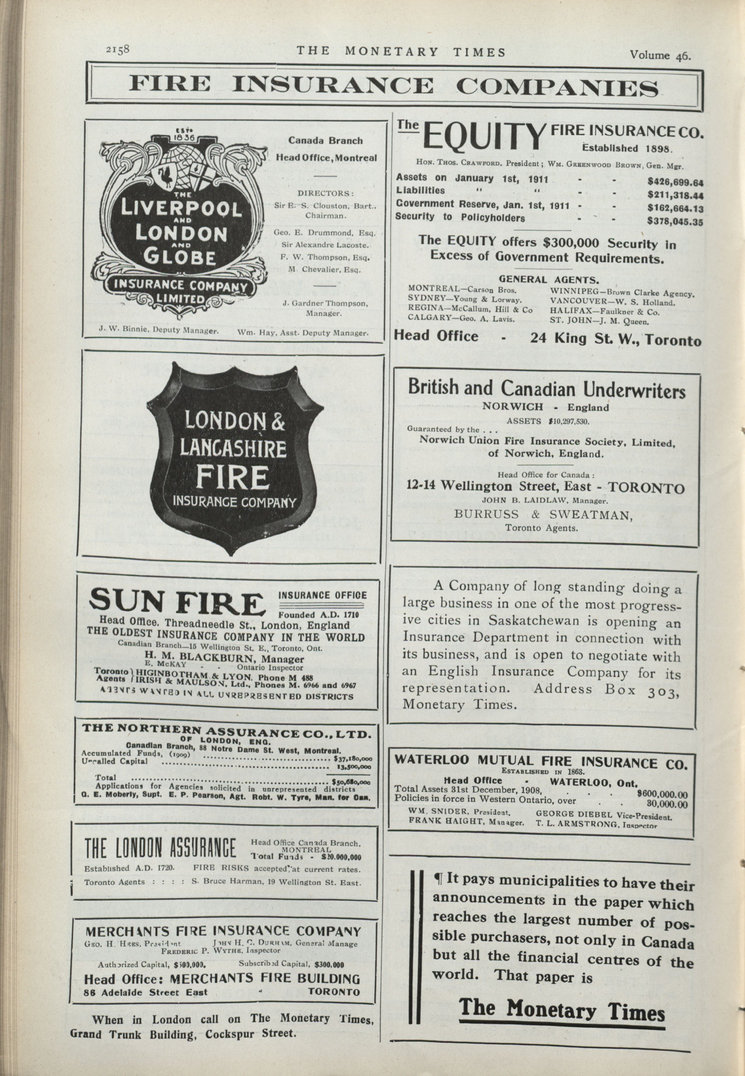 The monetary times, trade review and insurance chronicle : Vol. 46 No. 21 (May 27th, 1911.)