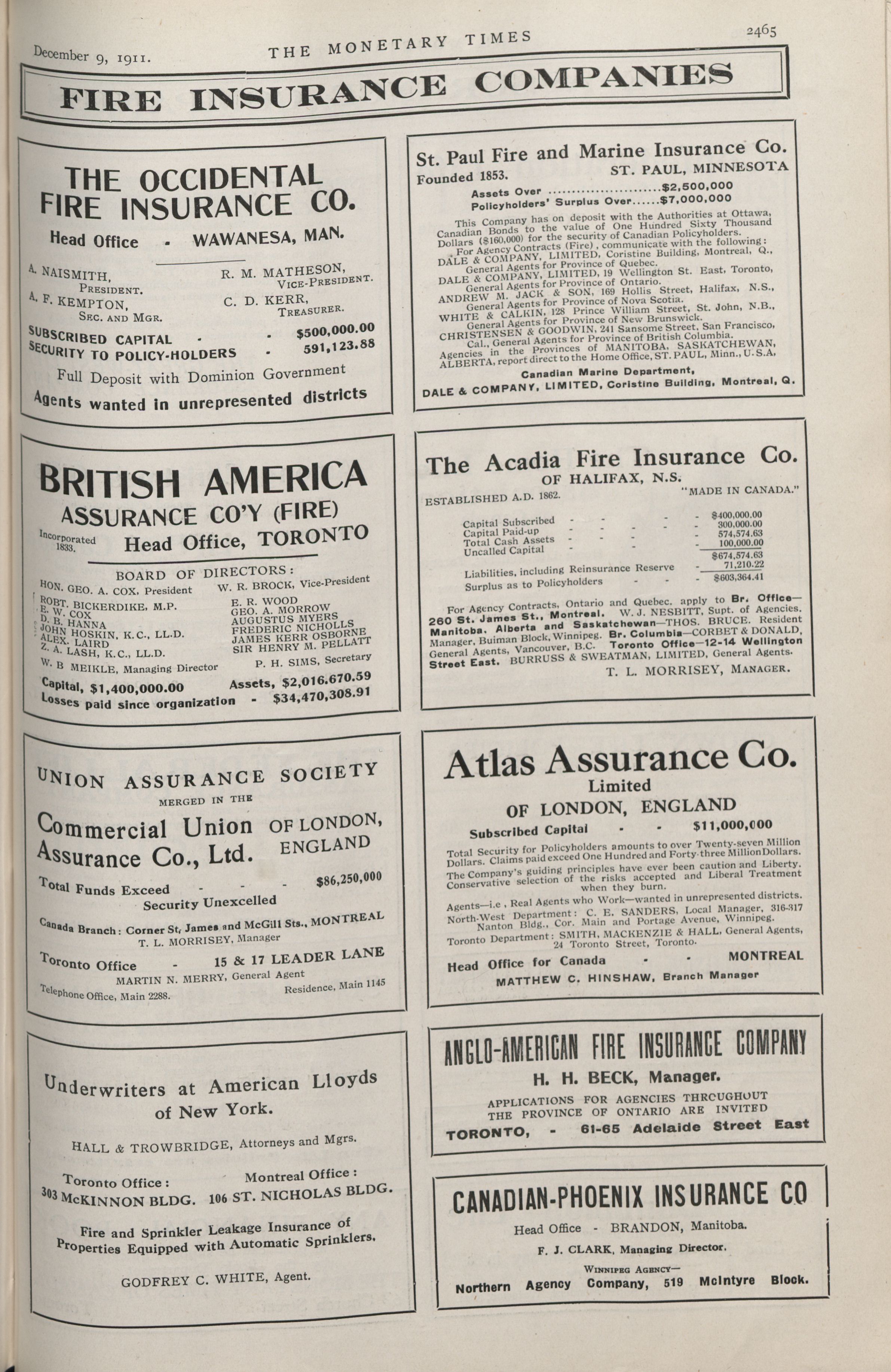 - The Monetary Times, trade review and insurance chronicle. : Vol. 47 No. 24 (December 9, 1911)