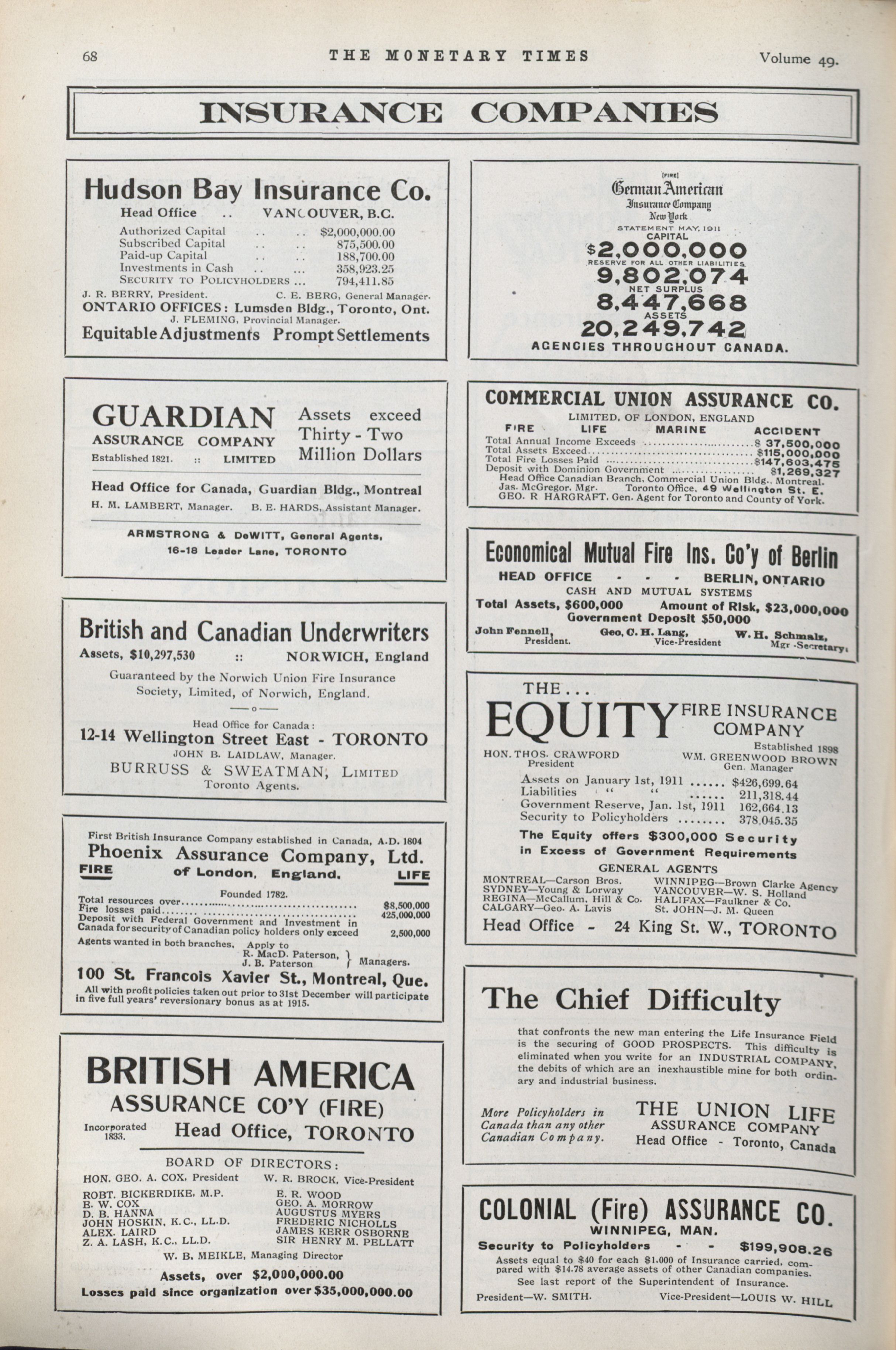 - The Monetary Times, trade review and insurance chronicle. : Vol. 49 No. 11 (September 14, 1912)