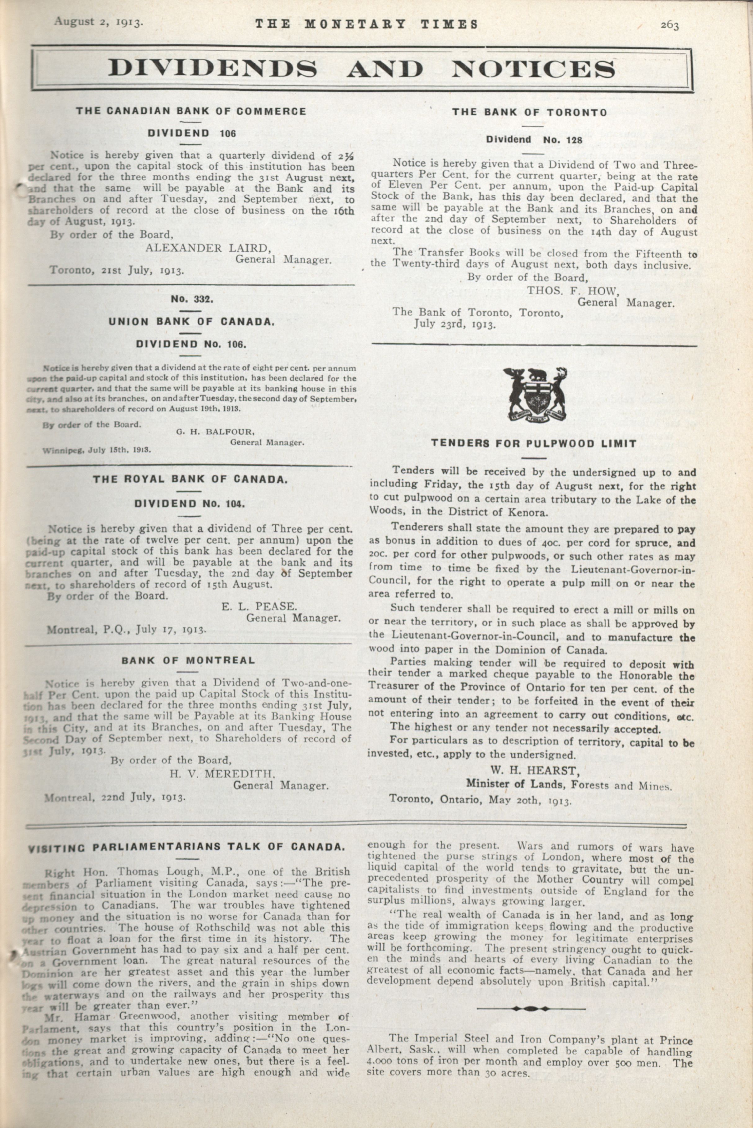- The Monetary Times, trade review and insurance chronicle. : Vol. 51 No. 5 (August 2, 1913)