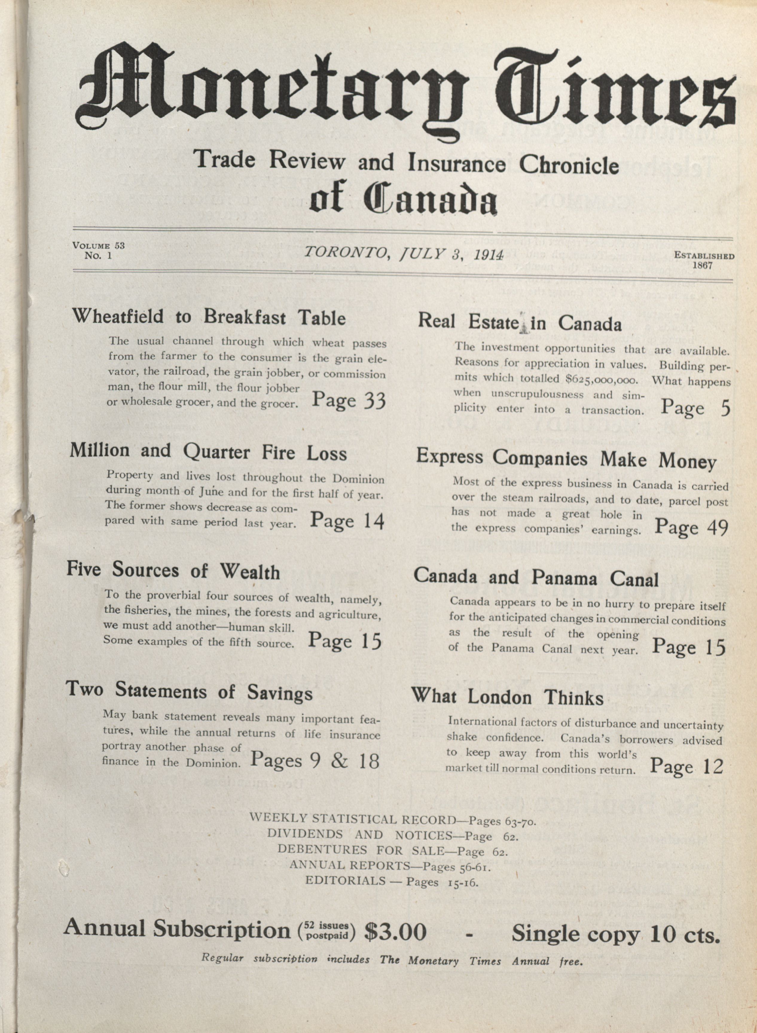 - The Monetary Times, trade review and insurance chronicle. : Volume 53 No. 1 (July 3, 1914)