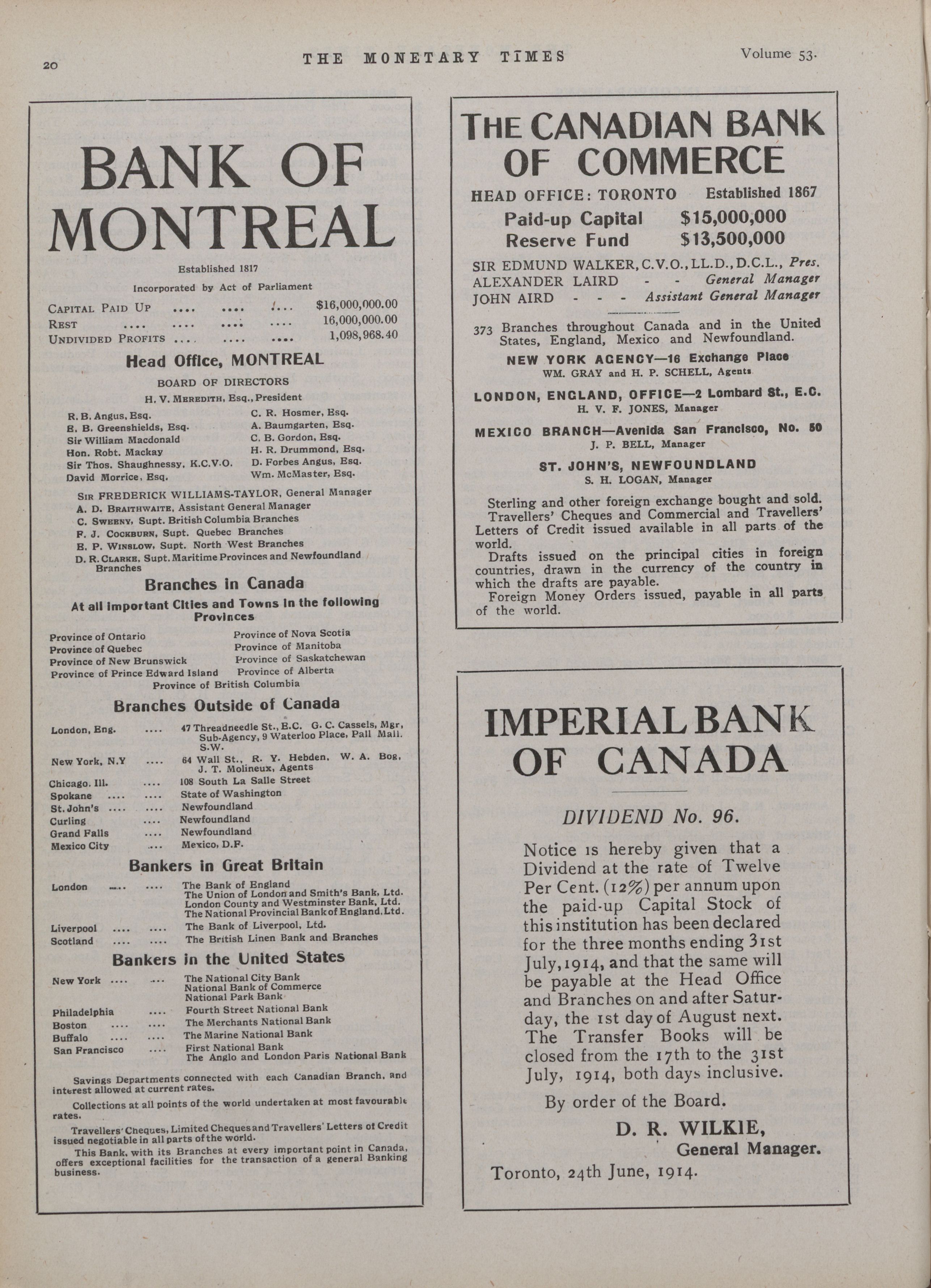 The Monetary Times, trade review and insurance chronicle. : Volume 53 No. 4 (July 24, 1914)
