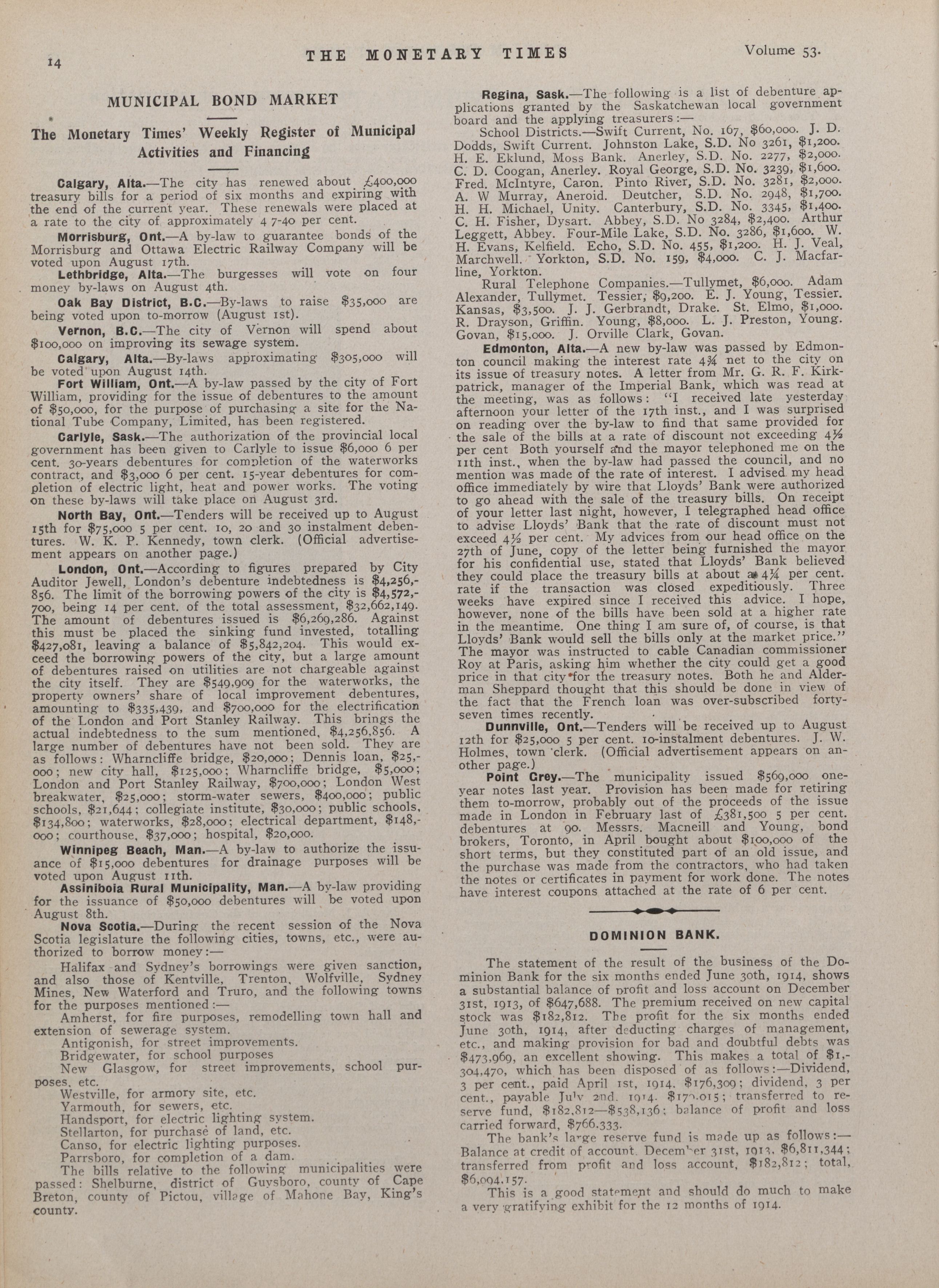 - The Monetary Times, trade review and insurance chronicle. : Volume 53 No. 5 (July 31, 1914)
