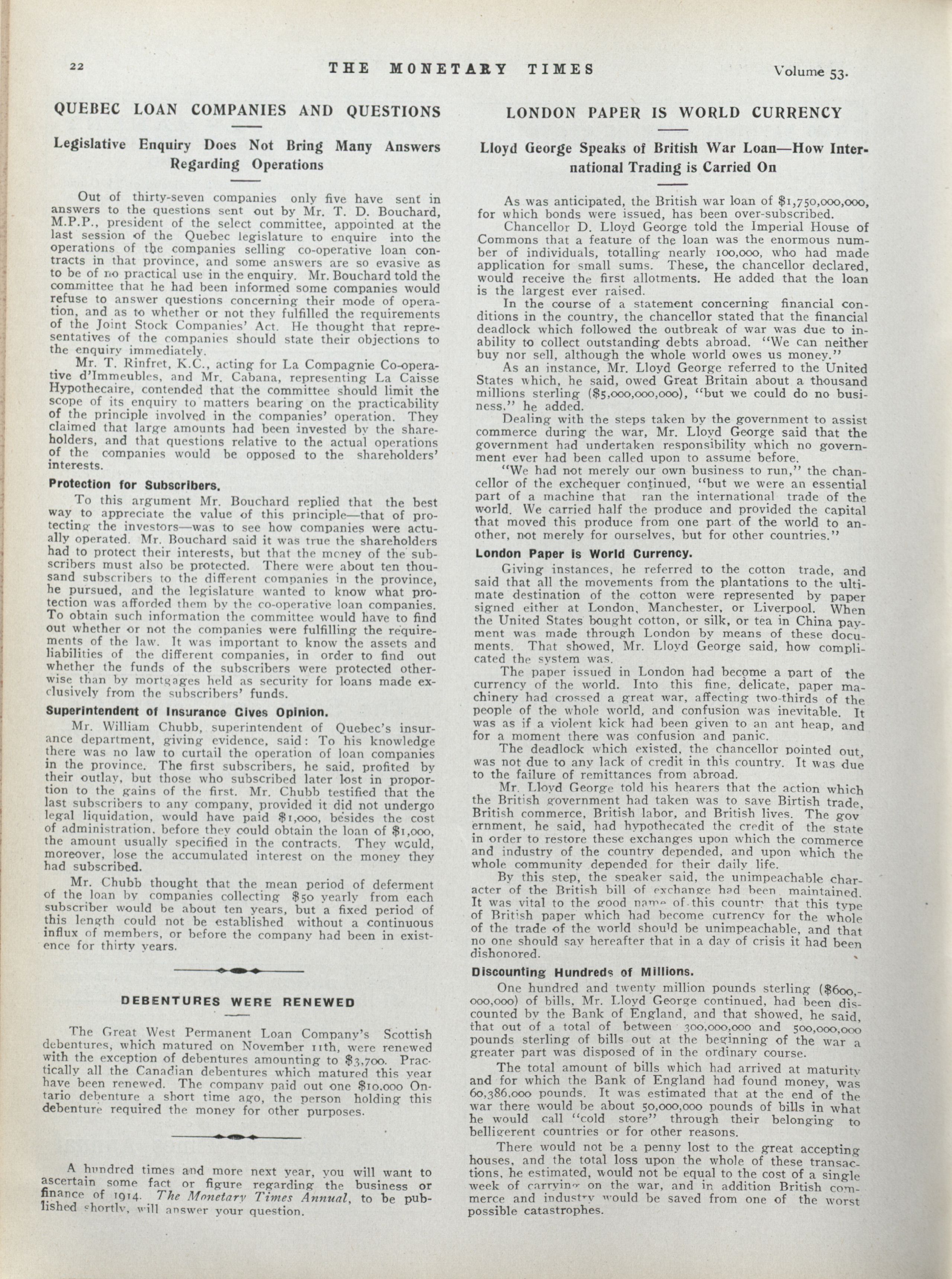 - The Monetary Times, trade review and insurance chronicle. : Volume 53 No. 23 (December 4, 1914)