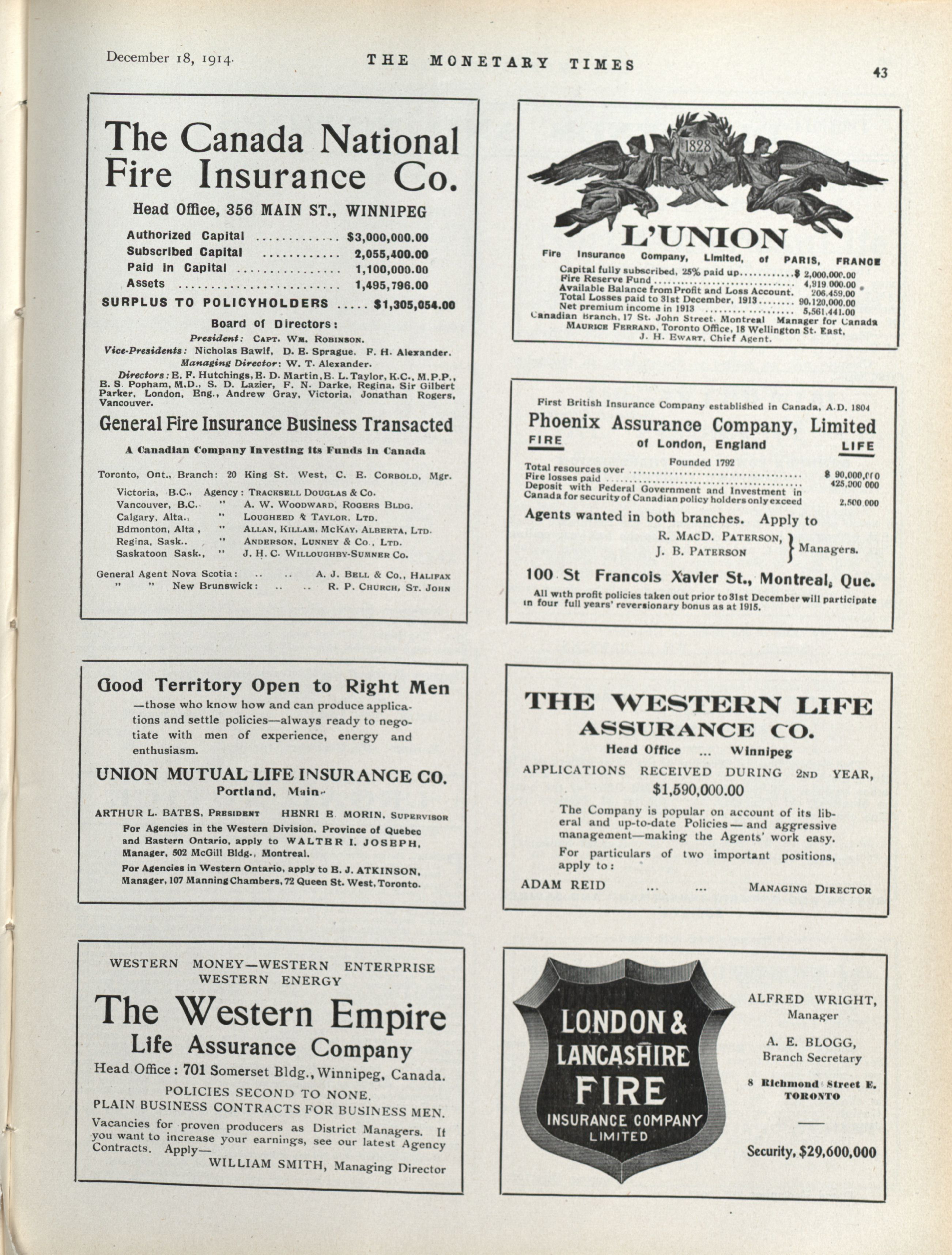 - The Monetary Times, trade review and insurance chronicle. : Volume 53 No. 25 (December 18, 1914)
