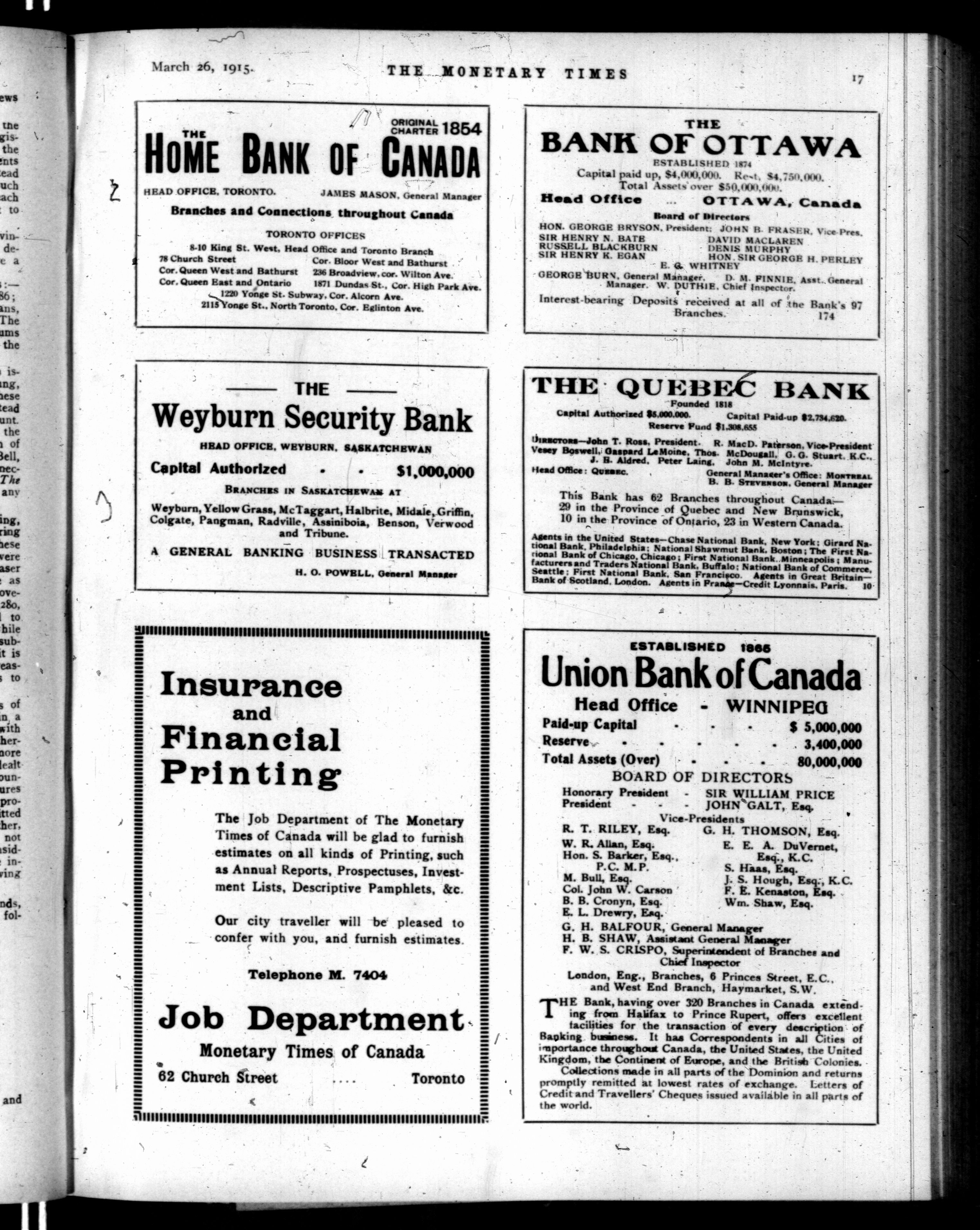 The monetary times, trade review and insurance chronicle : Volume 54, No. 13 (March 26, 1915)