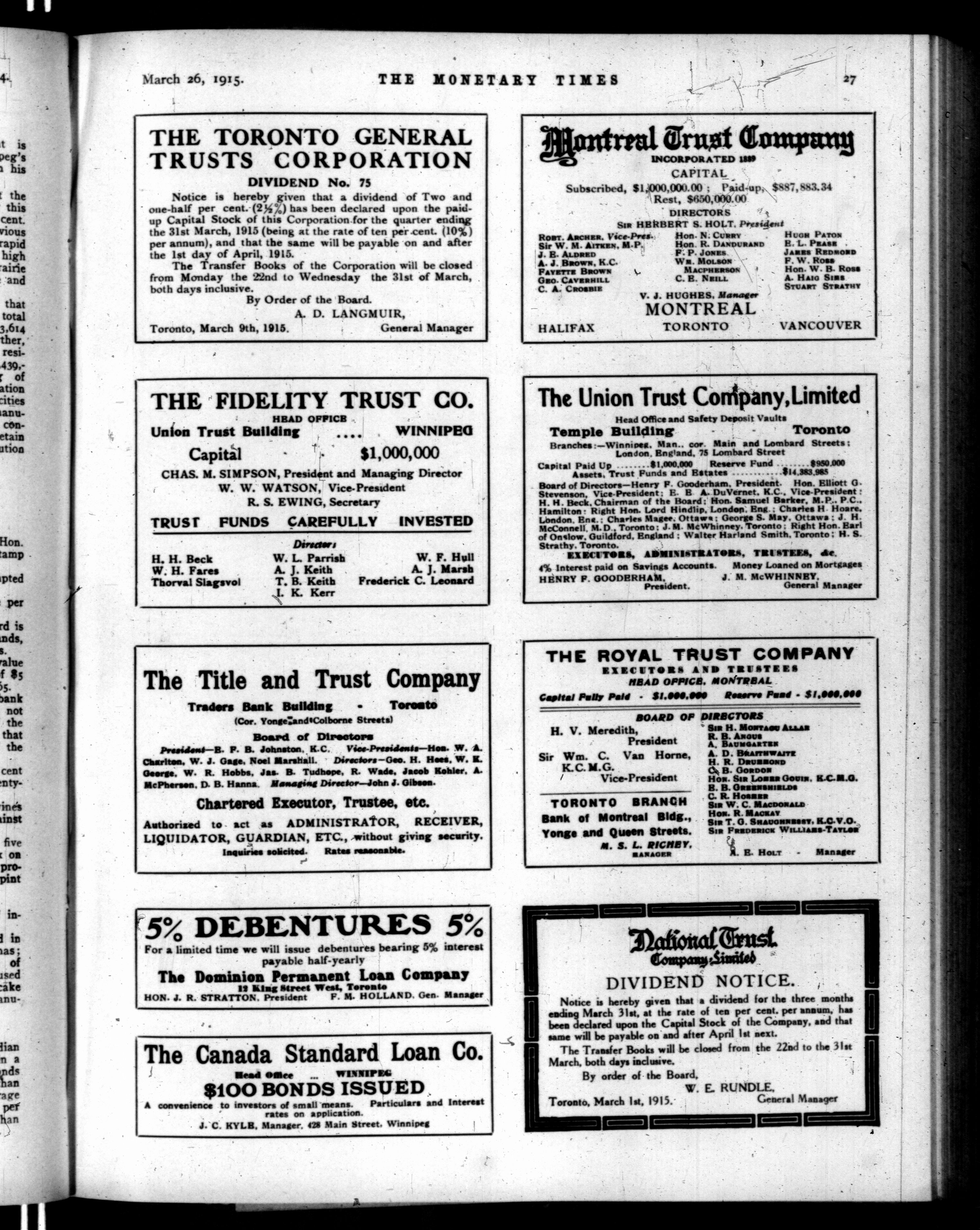 The monetary times, trade review and insurance chronicle : Volume 54, No. 13 (March 26, 1915)