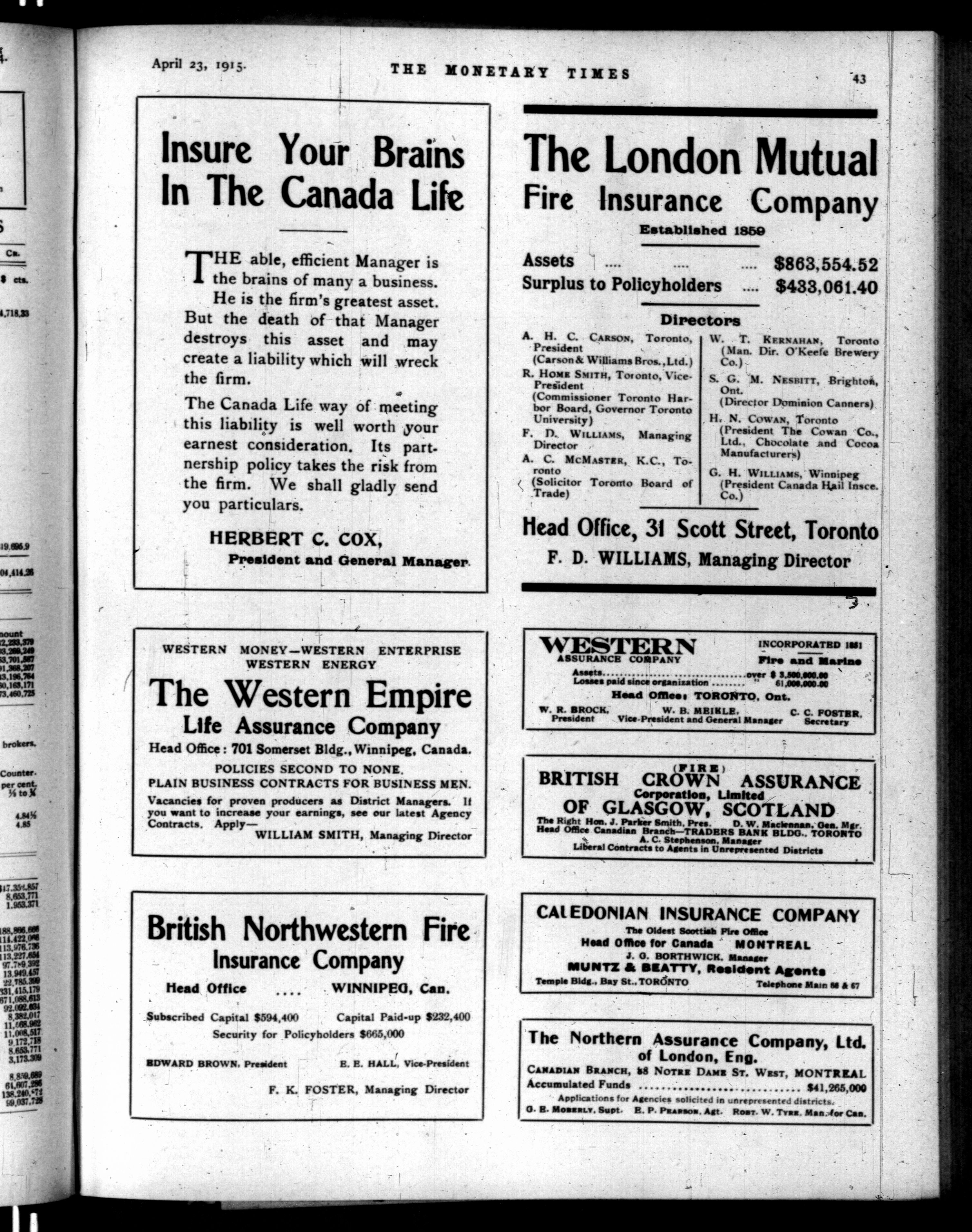 The monetary times, trade review and insurance chronicle : Volume 54, No. 17 (April 23, 1915)