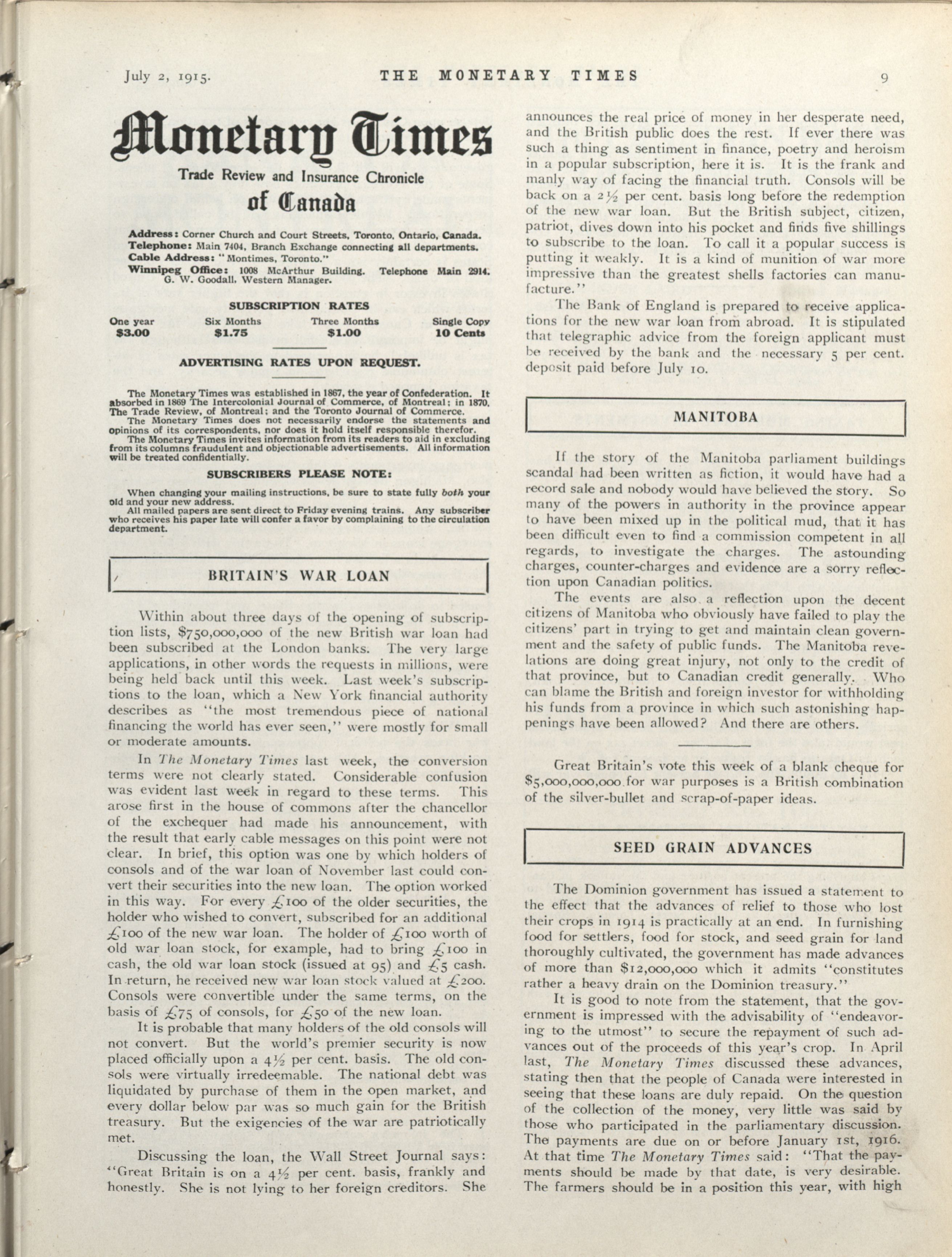 - The Monetary Times, trade review and insurance chronicle. : Volume 55 No. 1 (July 2, 1915)
