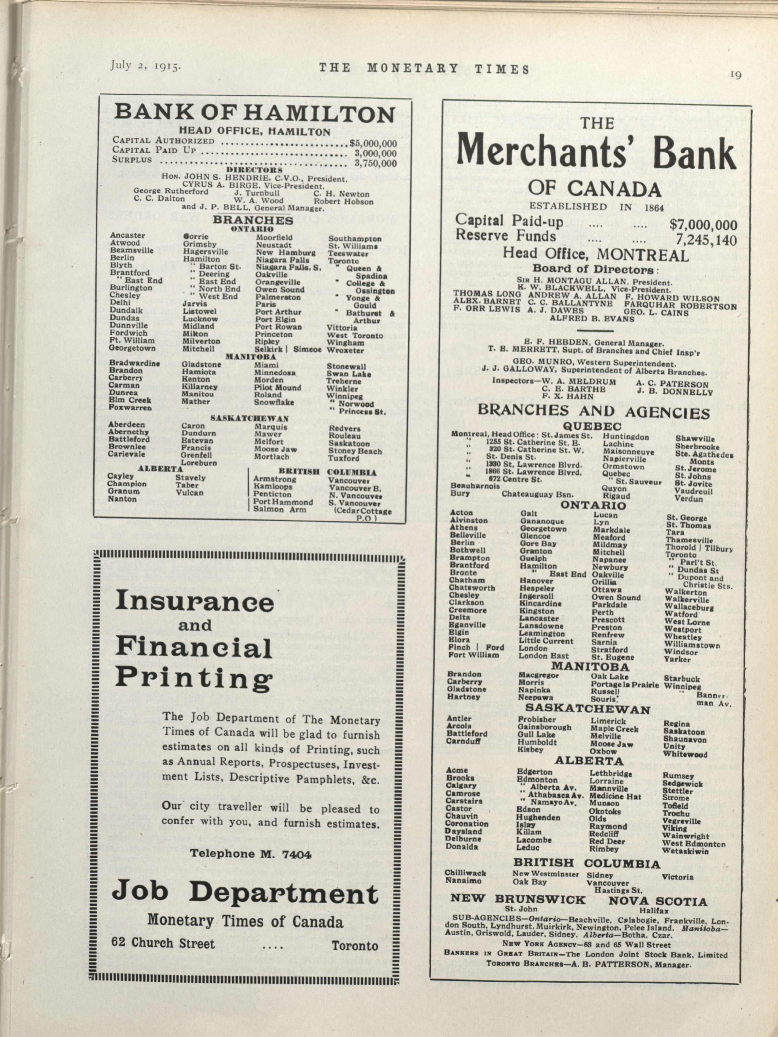 - The Monetary Times, trade review and insurance chronicle. : Volume 55 No. 1 (July 2, 1915)