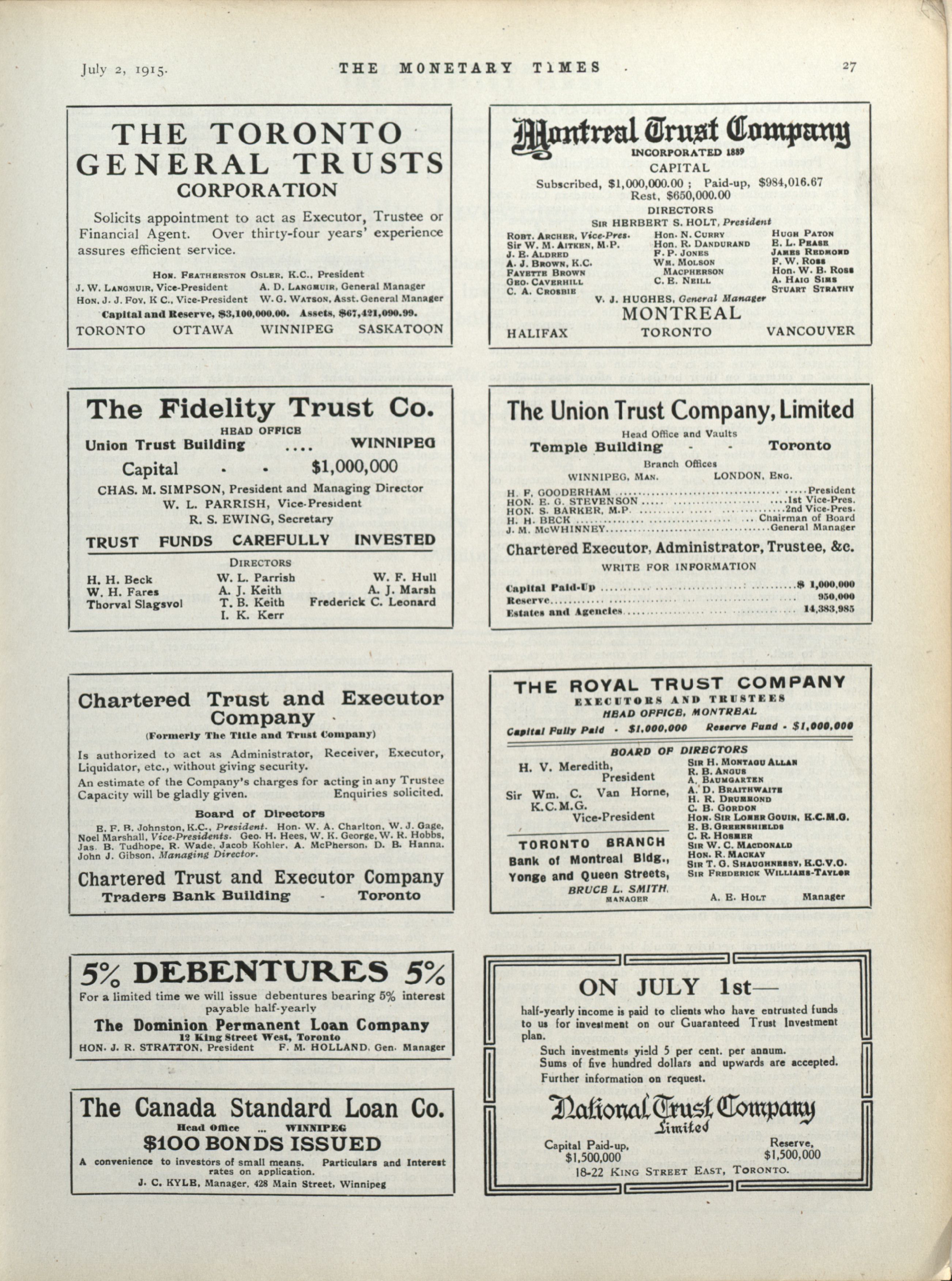 - The Monetary Times, trade review and insurance chronicle. : Volume 55 No. 1 (July 2, 1915)