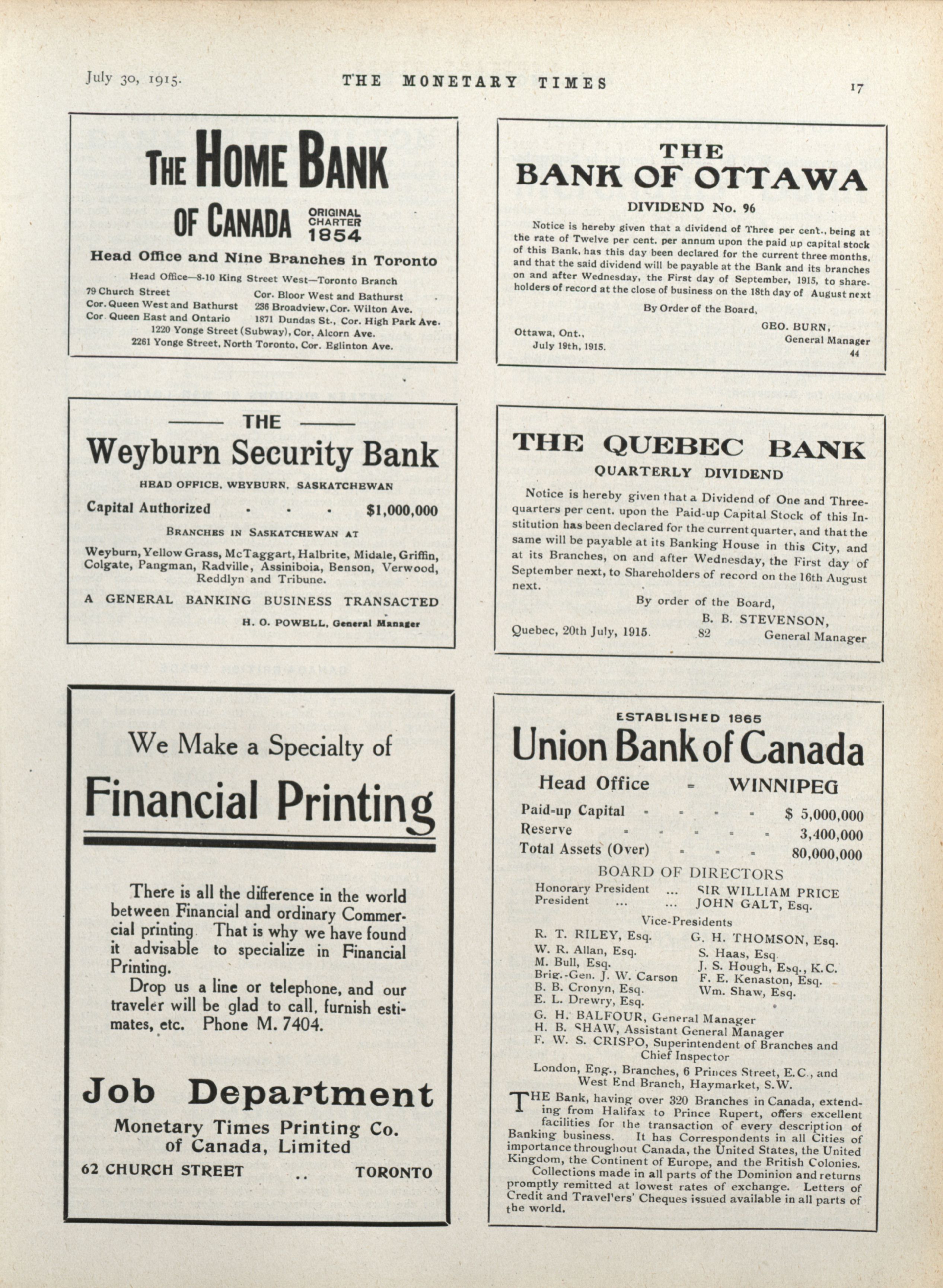- The Monetary Times, trade review and insurance chronicle. : Volume 55 No. 5 (July 30, 1915)