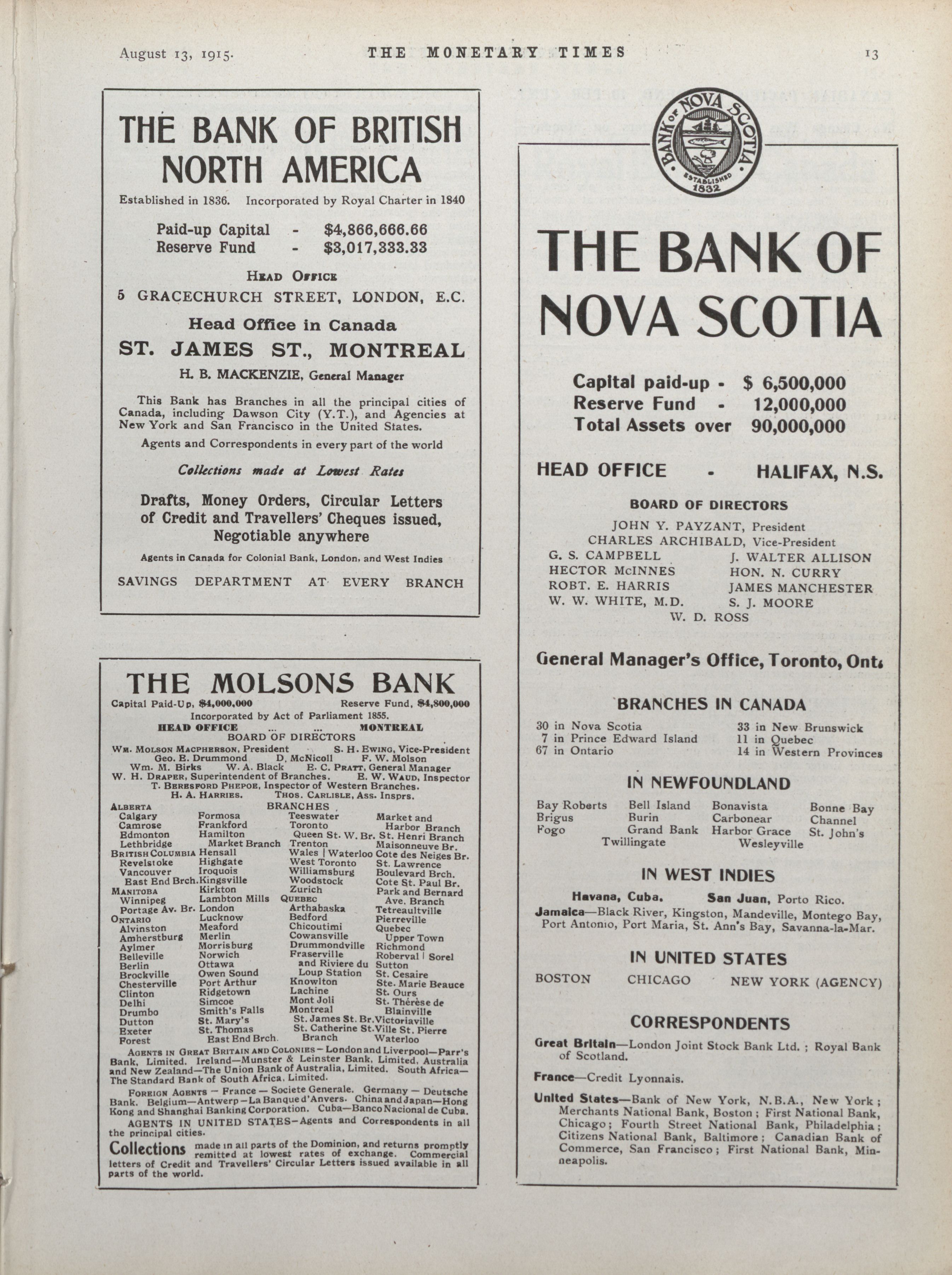 - The Monetary Times, trade review and insurance chronicle. : Volume 55 No. 7 (August 13, 1915)