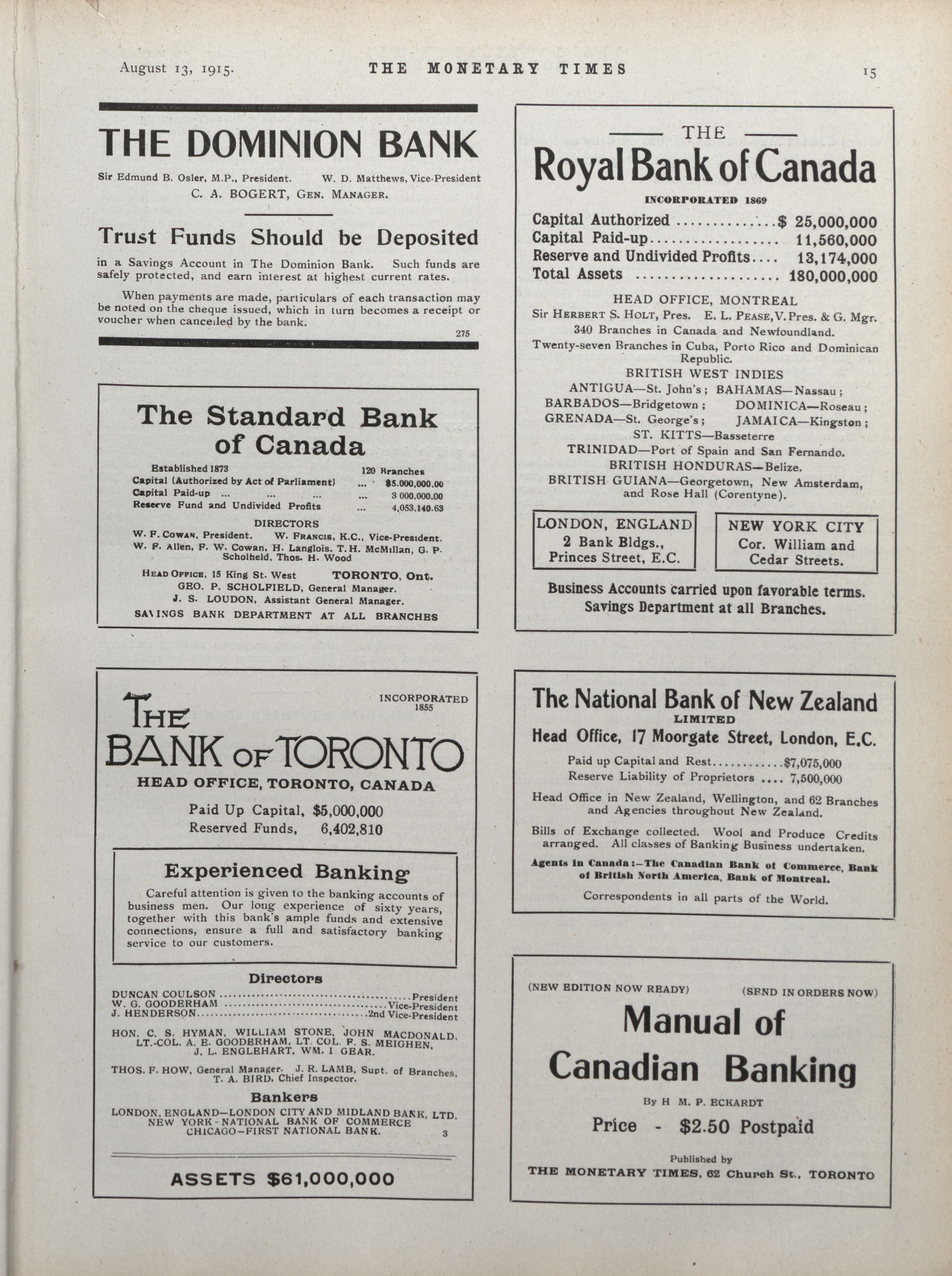 The monetary times, trade review and insurance chronicle : Volume 55 No. 7 (August 13, 1915)